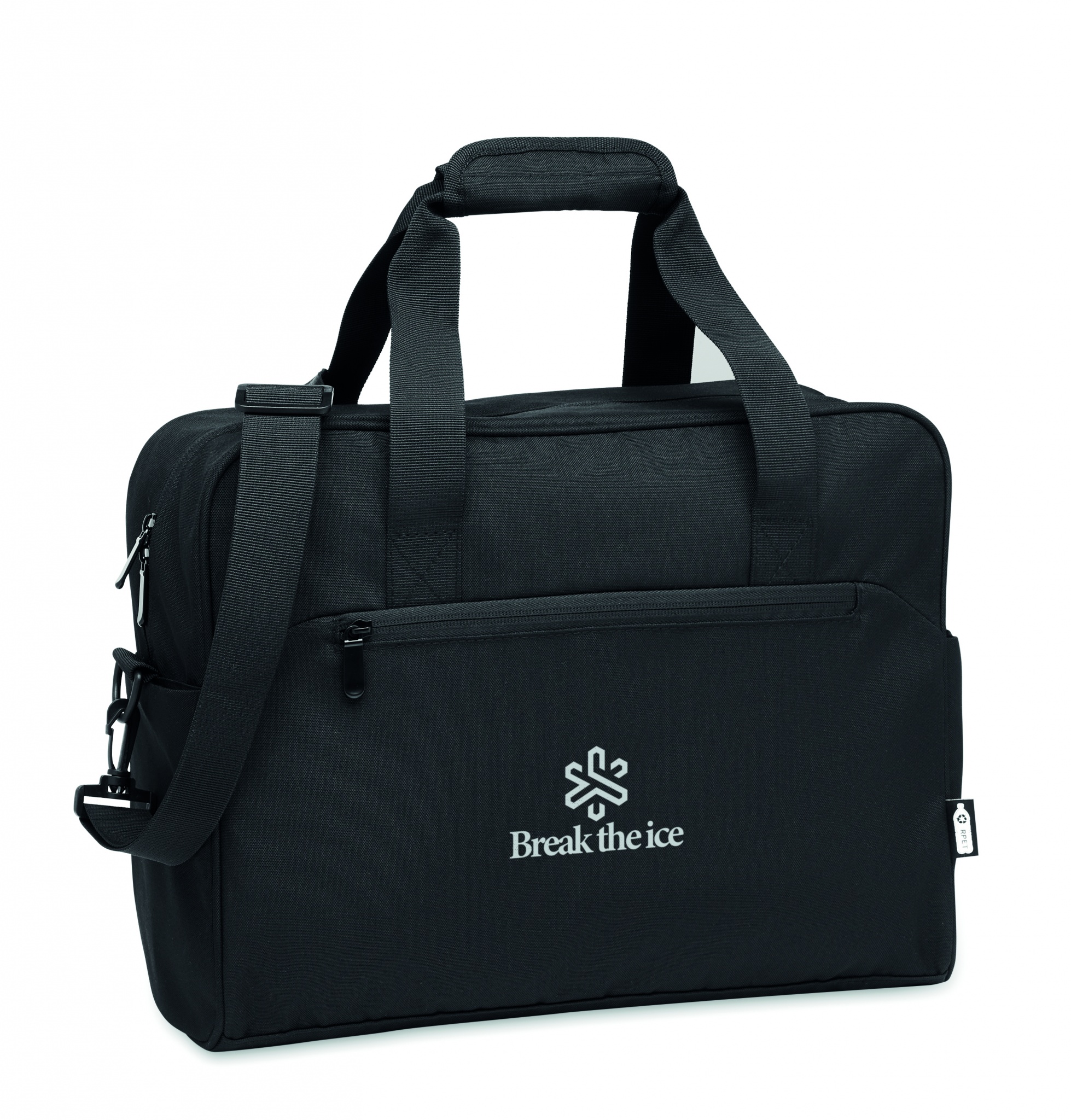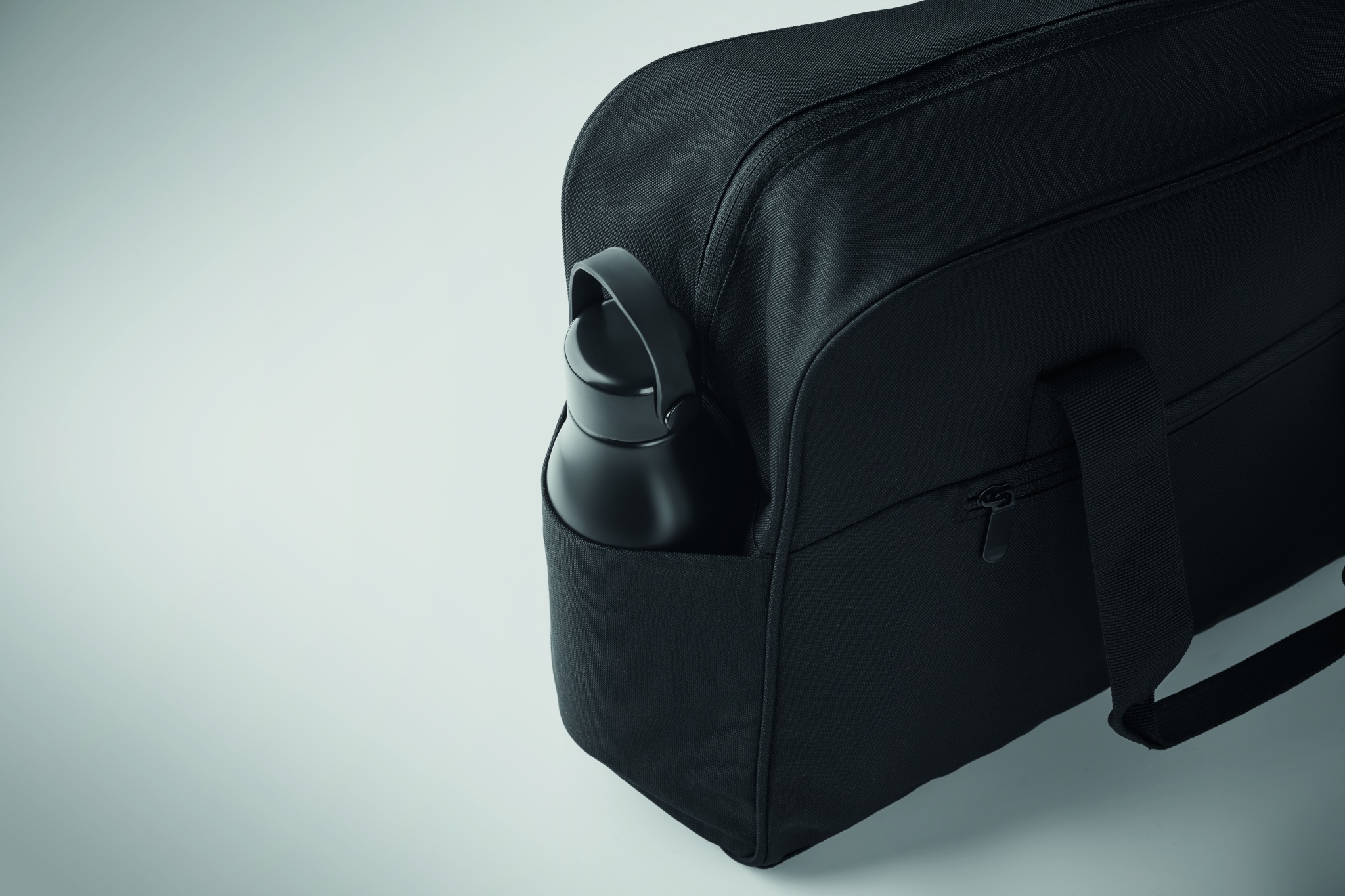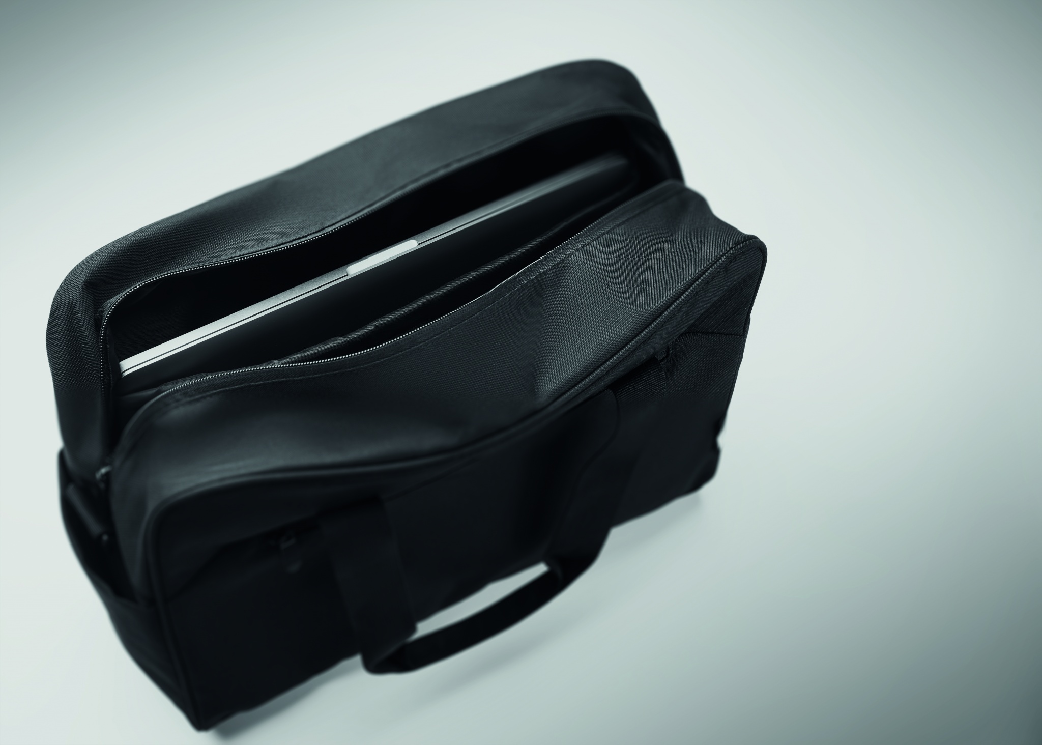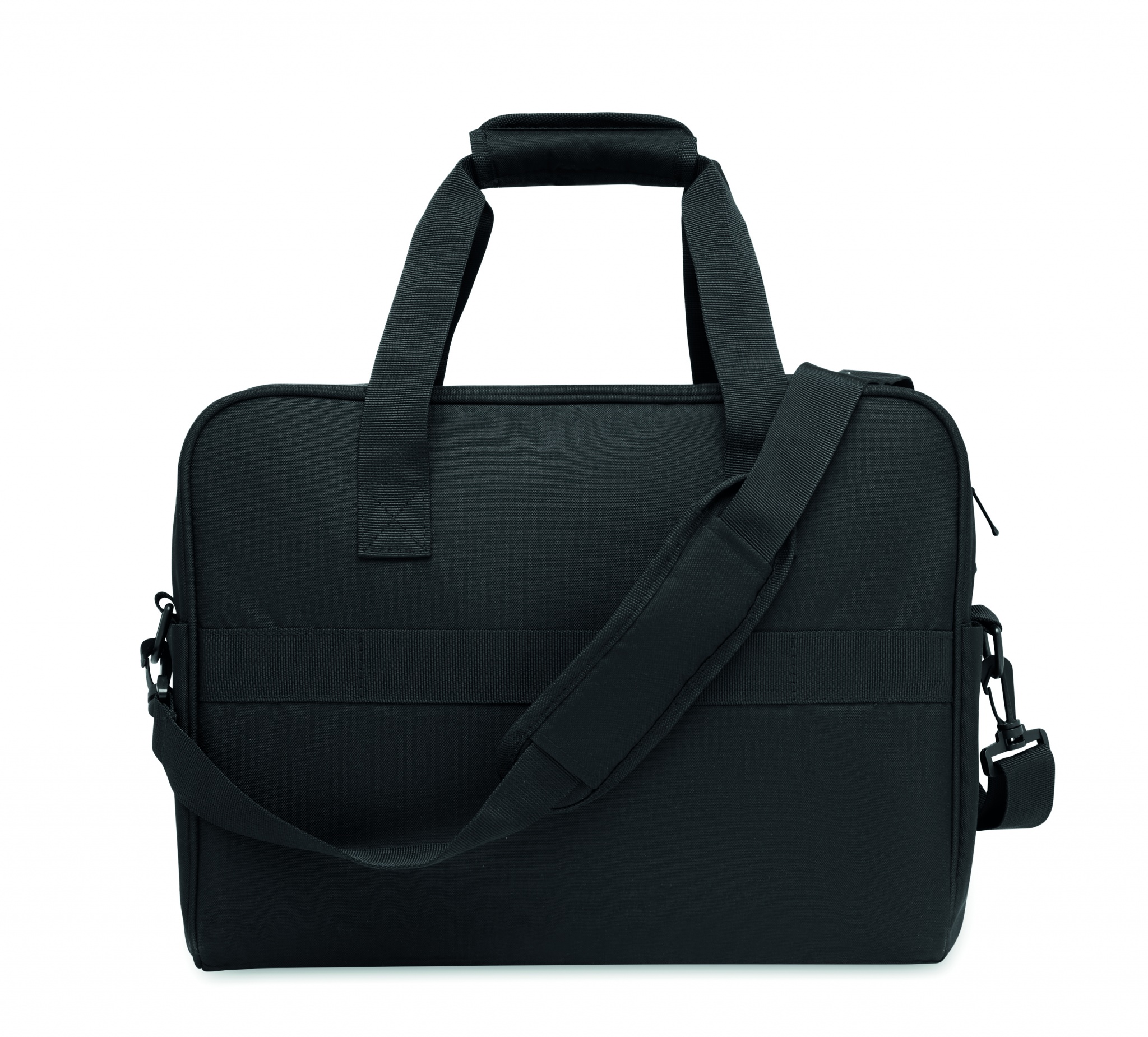 Käsimatkatavaralaukku 600D RPET:stä, jossa on suuri vetoketjullinen etutasku, kaksi pientä sivutaskua. Sisältää 15 tuuman kannettavan tietokoneen lokeron. Pehmustettu irrotettava ja säädettävä olkahihna. Trolleypidike kääntöpuolella.