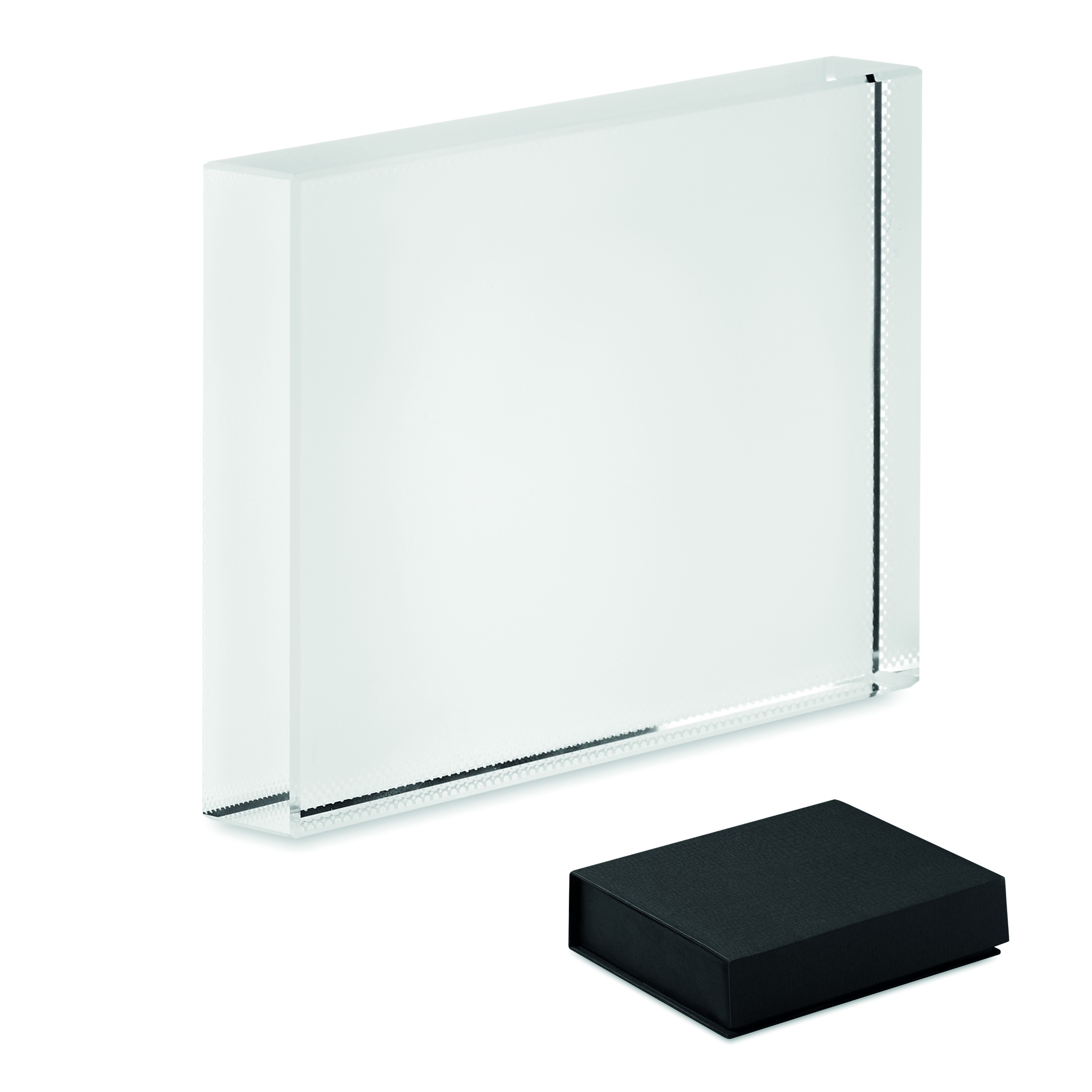 Kristallipalkinto tai valokuvakehys, pakattuna lahjapakkaukseen.