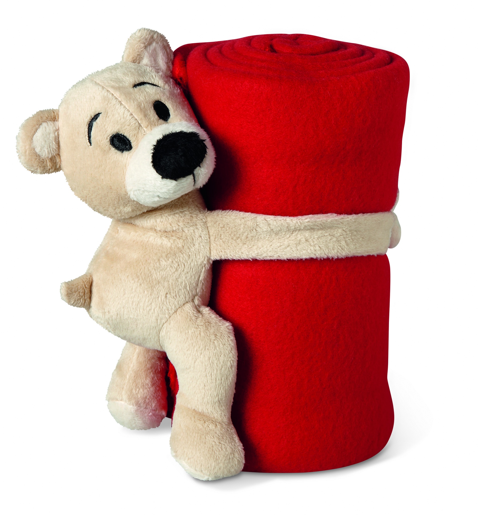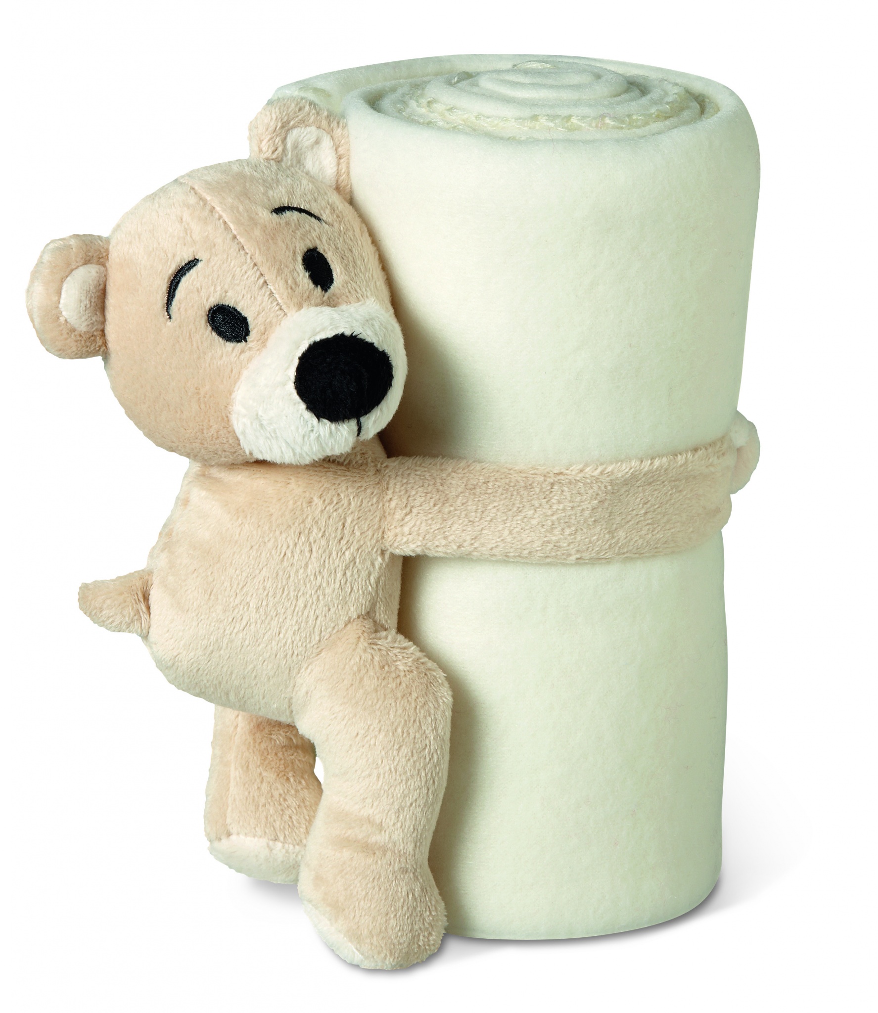 Lasten fleecehuopa, nallekarhulla pitää peiton rullalla kiinnitysnauhakäsillä.