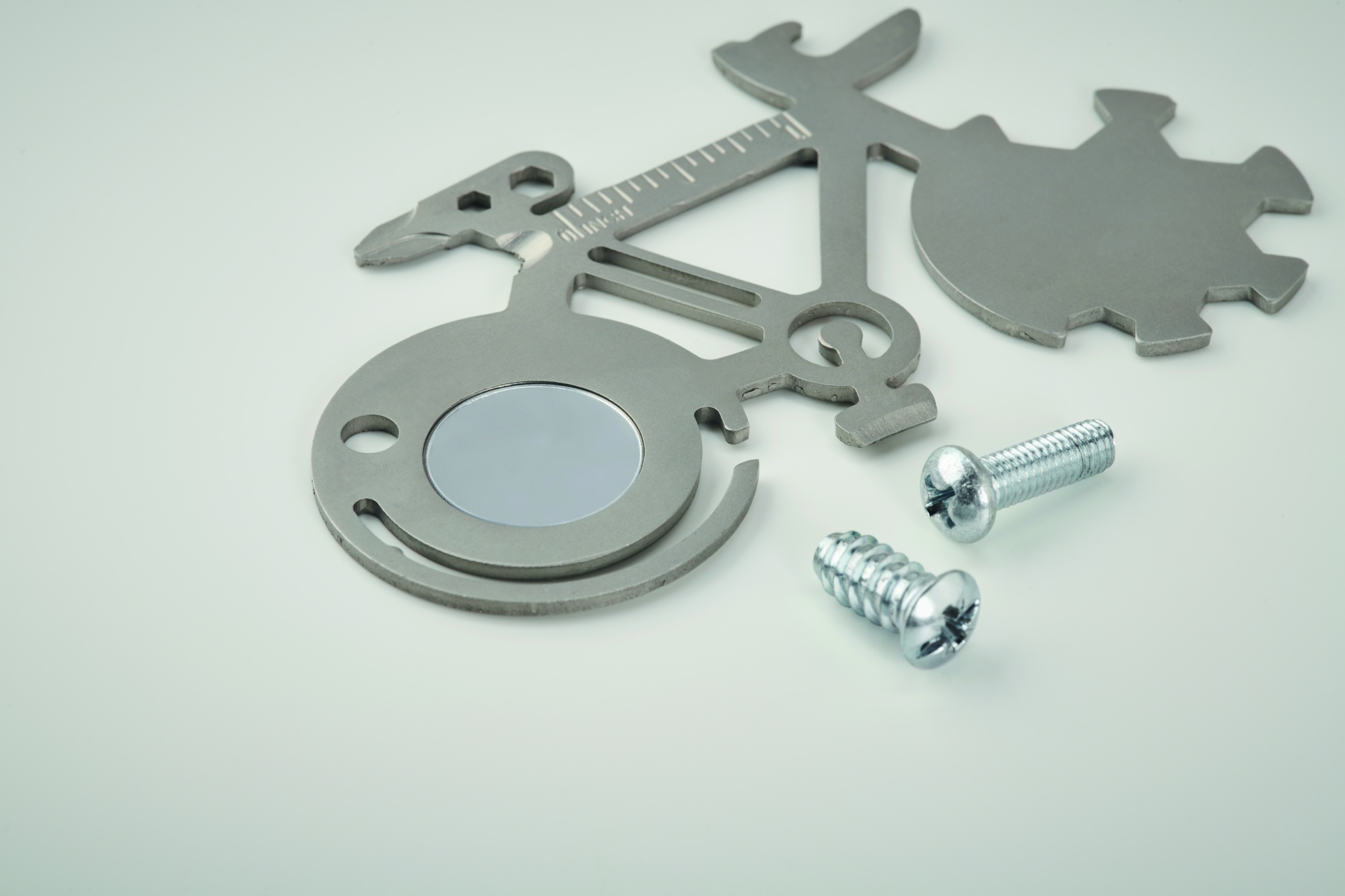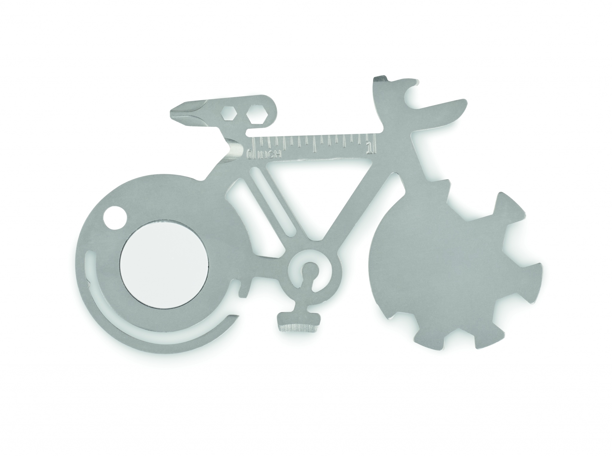 Monitoimityökalu 11-in-1. Polkupyörän muotoinen, ruostumattomasta teräksestä valmistettu työkalu jossa on mm. pullonavaaja, veitsi, viivain ja ruuvimeisselit.