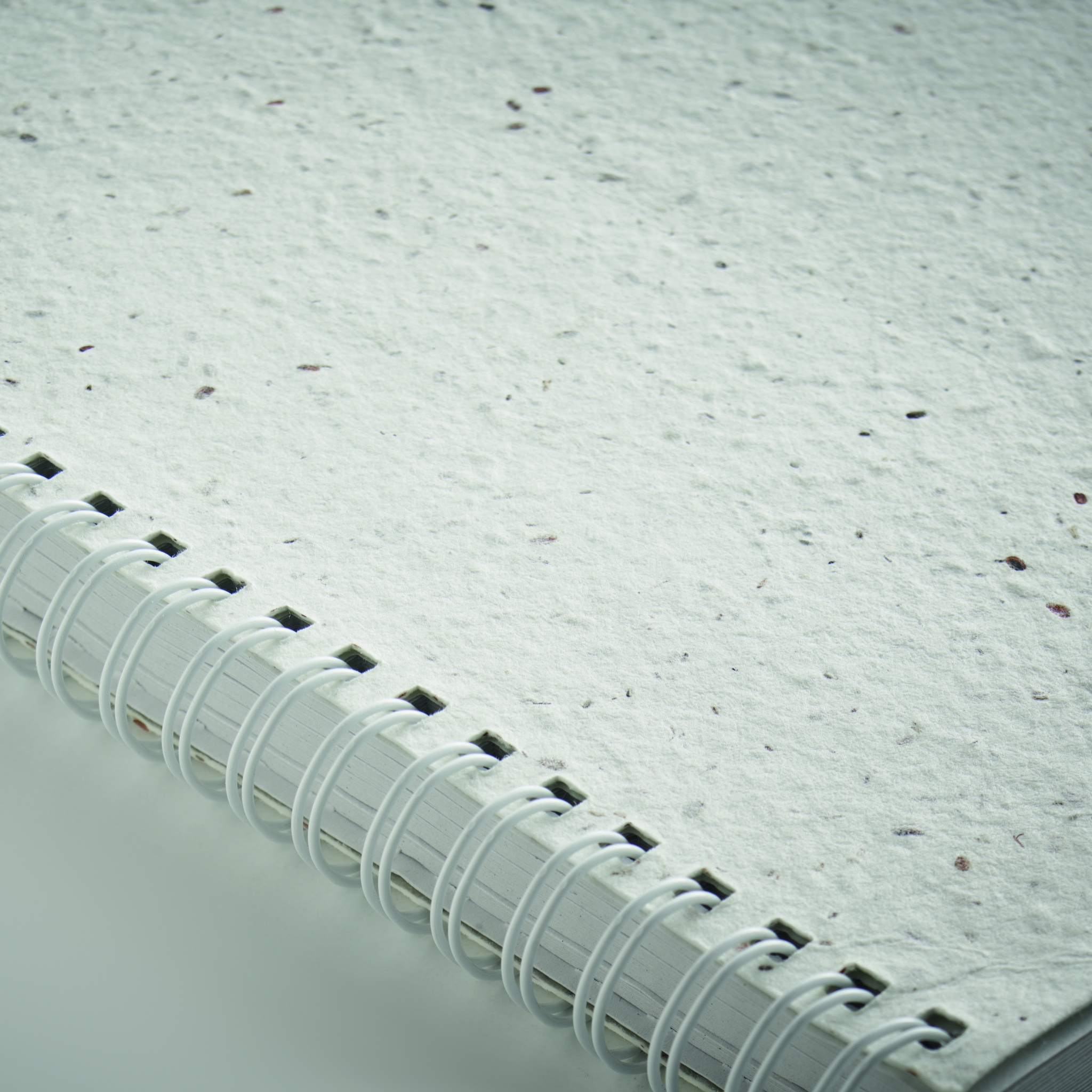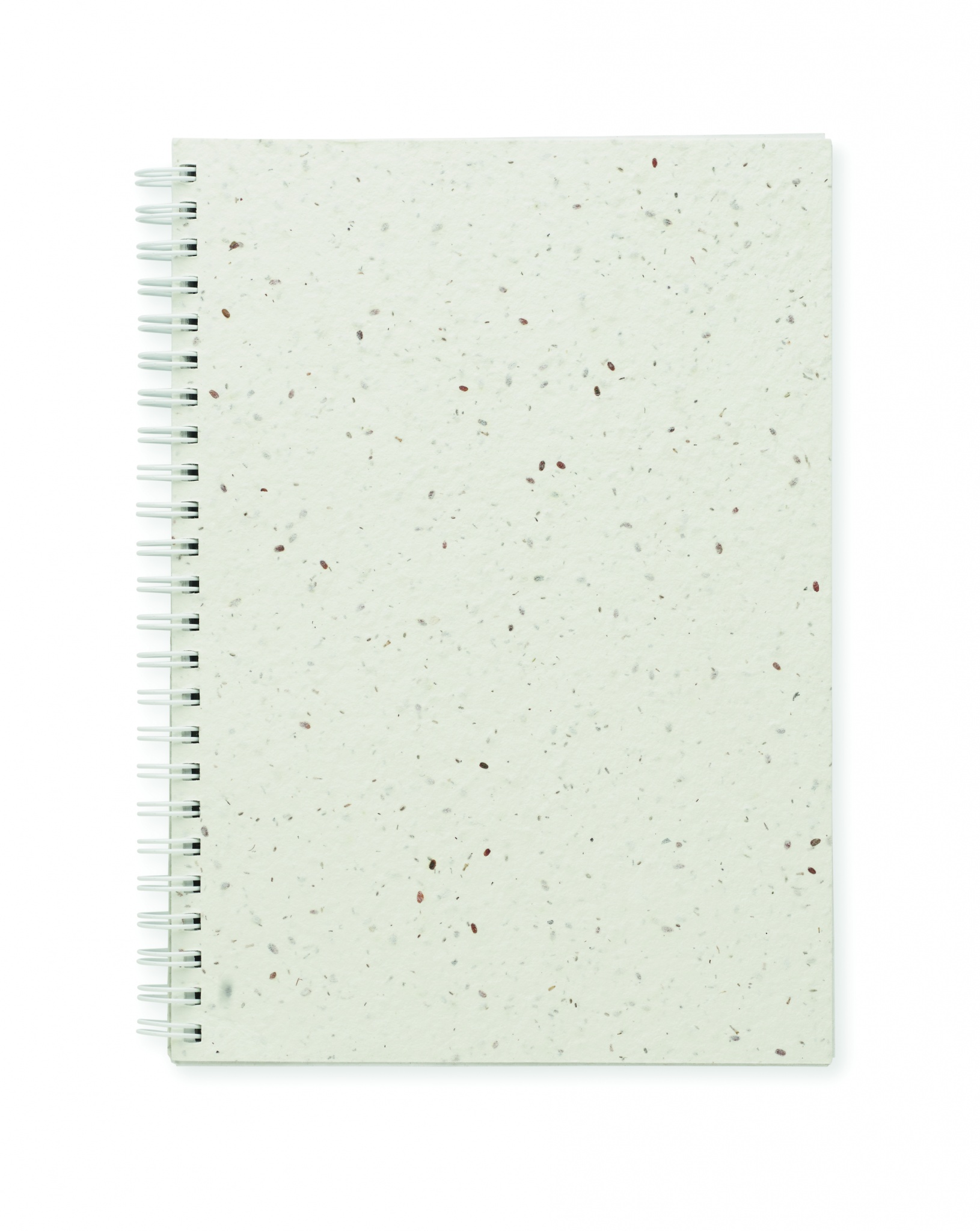 A5-muistikirja, jonka kansi on siemenpaperia. Kierresidottu. 200 kierrätettyä viivoitettua sivua (100 arkkia).