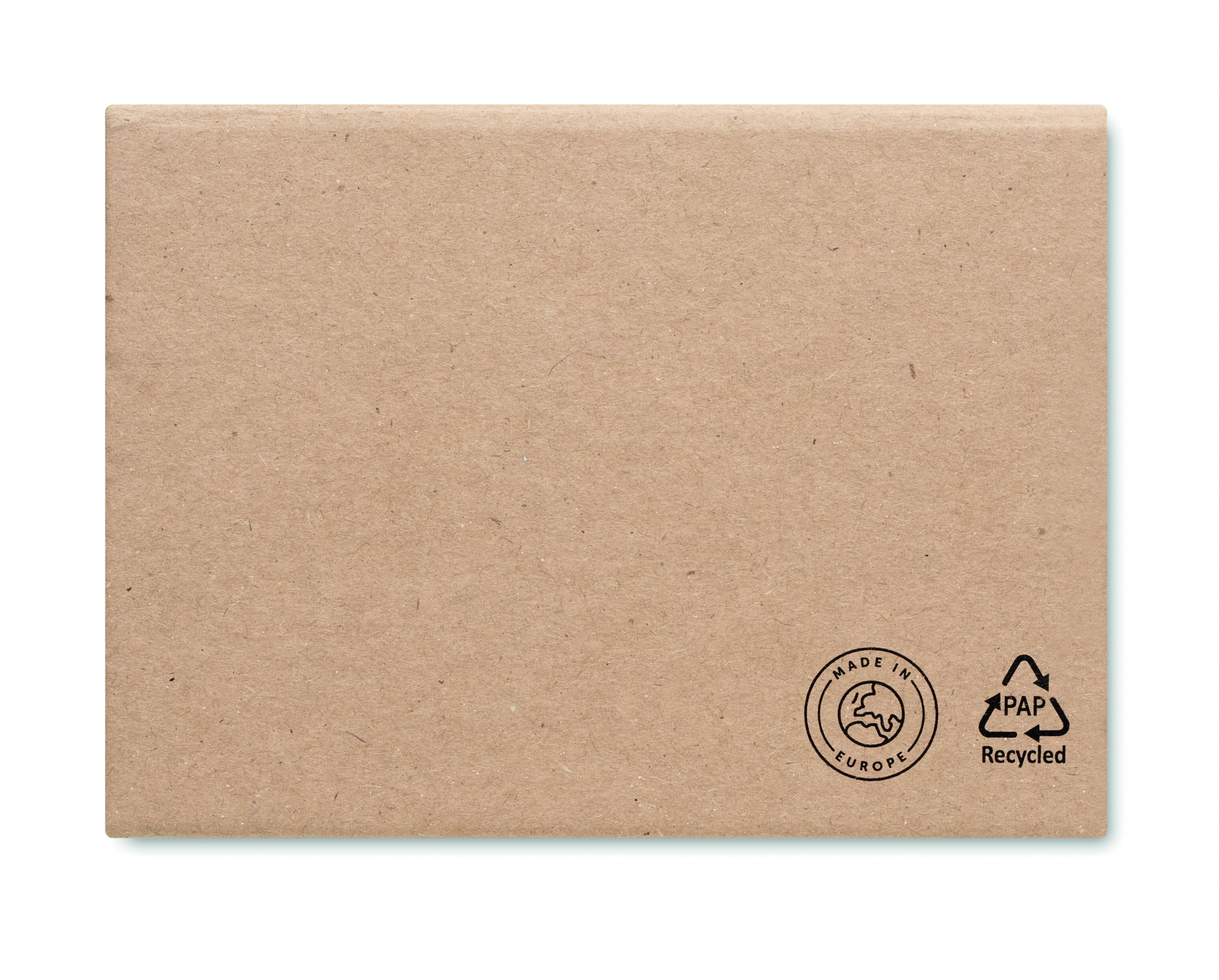 3-osainen kierrätyspaperista valmistettu muistilappuvihko. Suuret ja keskikokoiset muistilaput ja 5 eriväristä sivumerkkiä. Valmistettu EU:ssa.