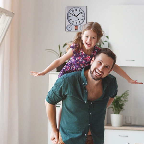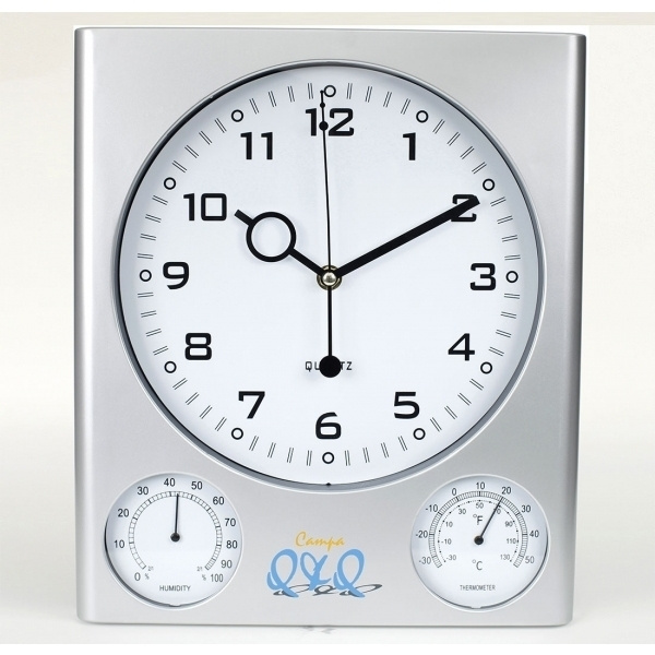 Tyylikäs seinäkello hienovalkoisella kellotaululla ja mattahopealla pinnalla; näyttää ajan, kosteuden ja lämpötilan. Painamme logosi hygro- ja lämpömittarin väliin.