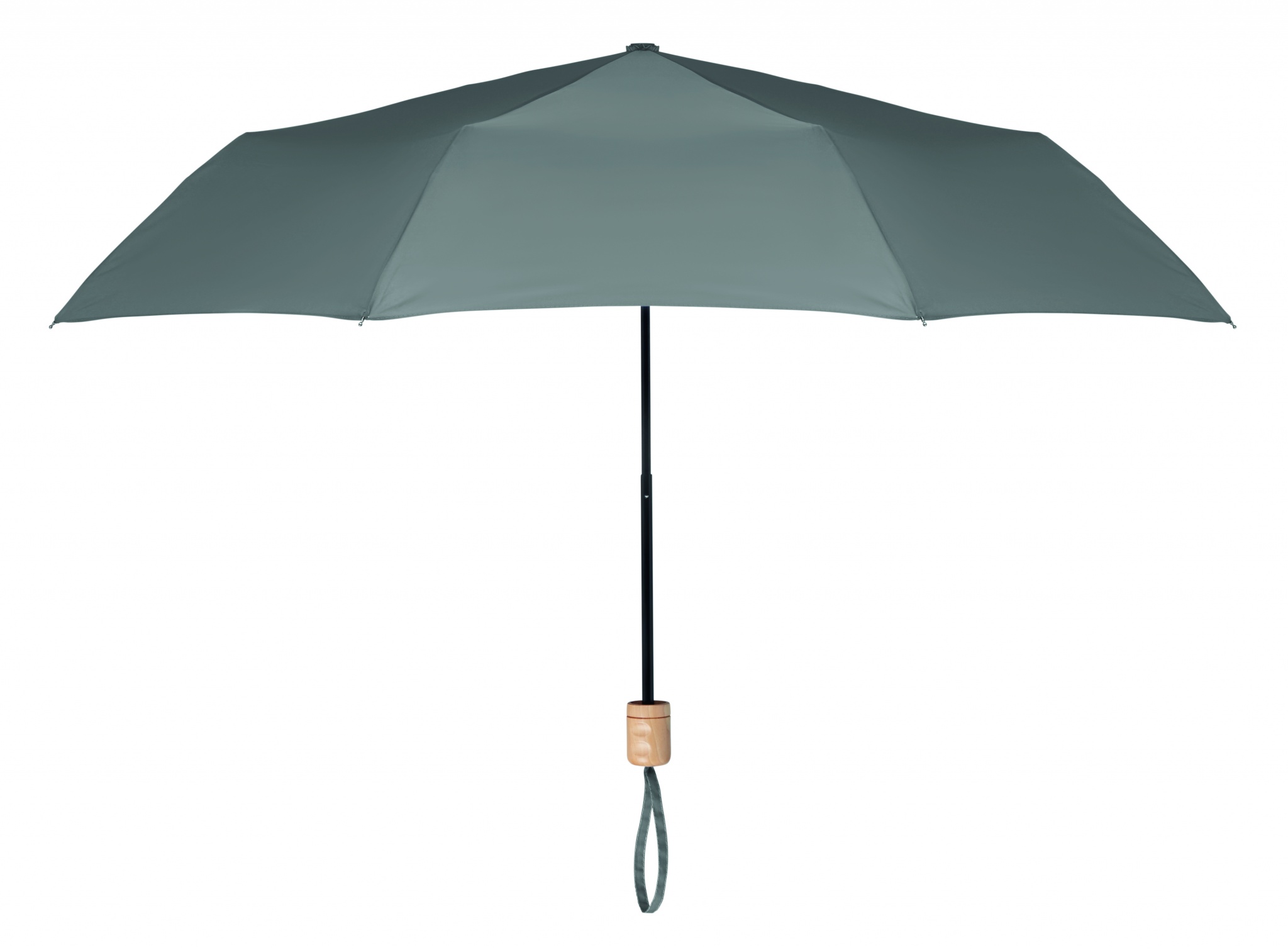 190T RPET-pongee 21 tuuman kokoontaitettava myrskysateenvarjo. Mustalla päällystetty runko ja ruoteet, puinen kahva. Manuaalinen avaus / suljin, sisältää yhteensopivan säilytyspussin.