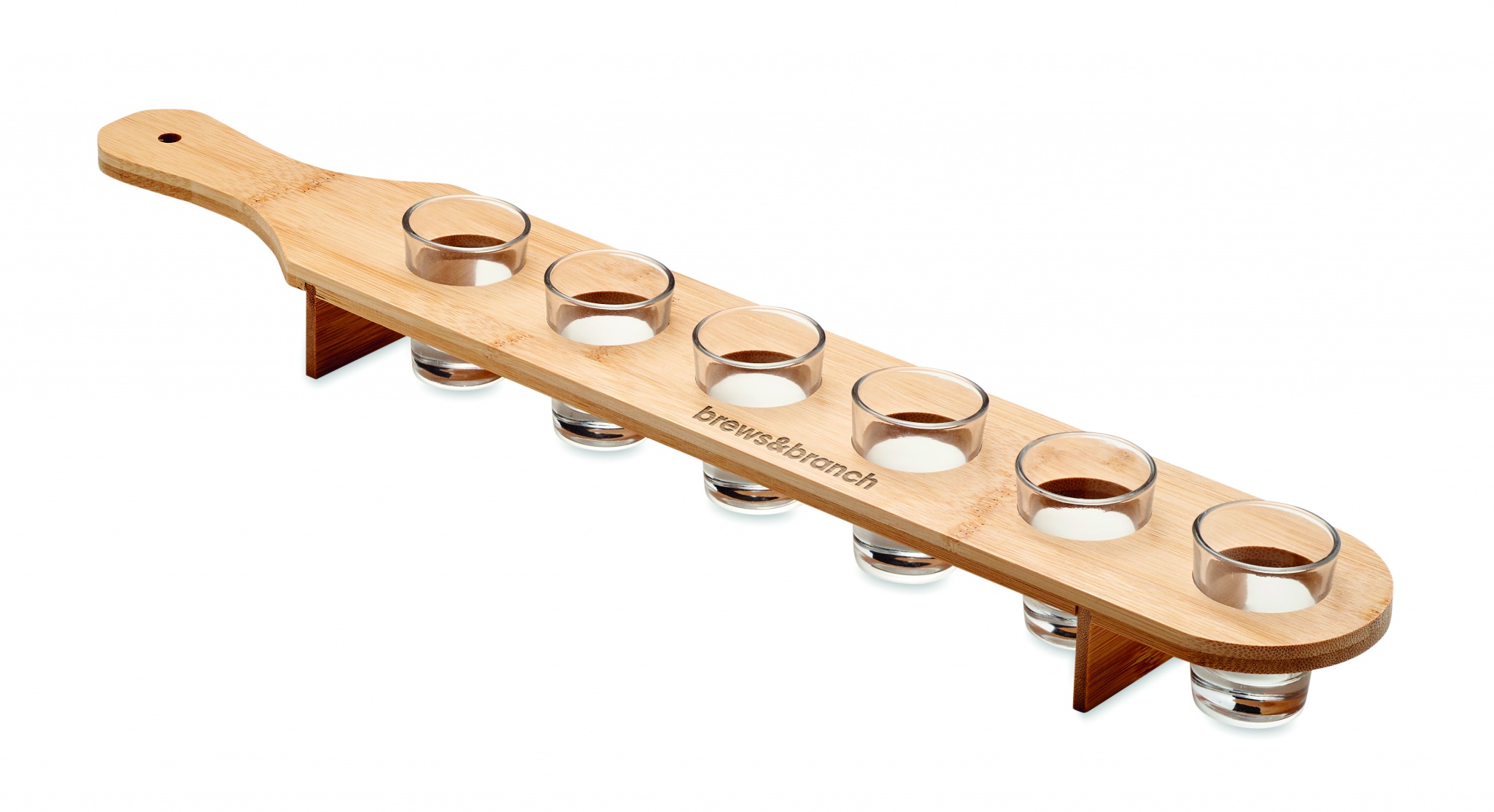 6x 20 ml shottilasinsetti bambuisella tarjottimella.