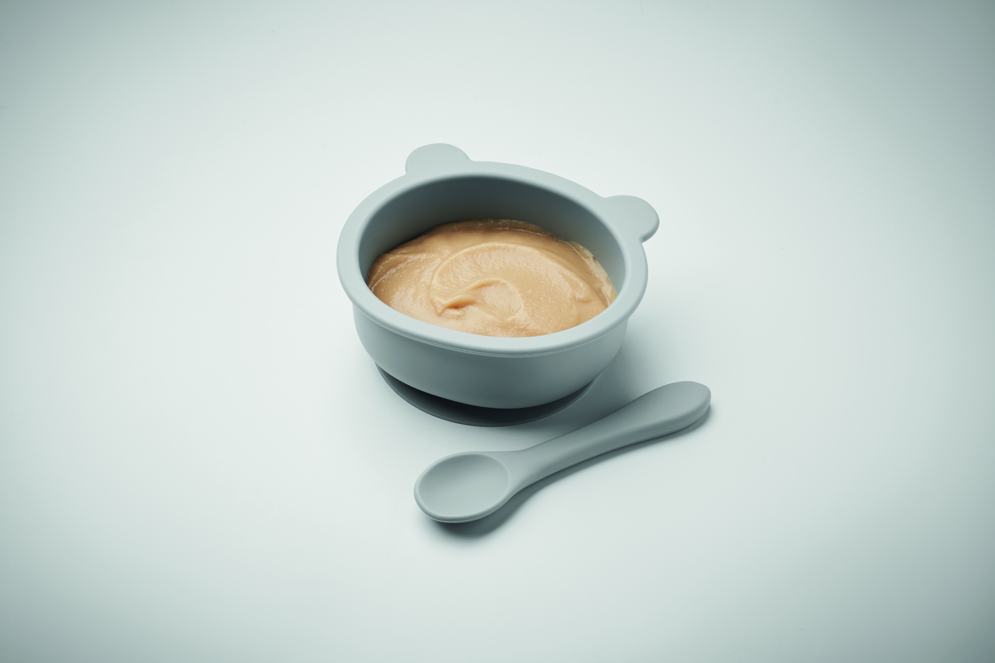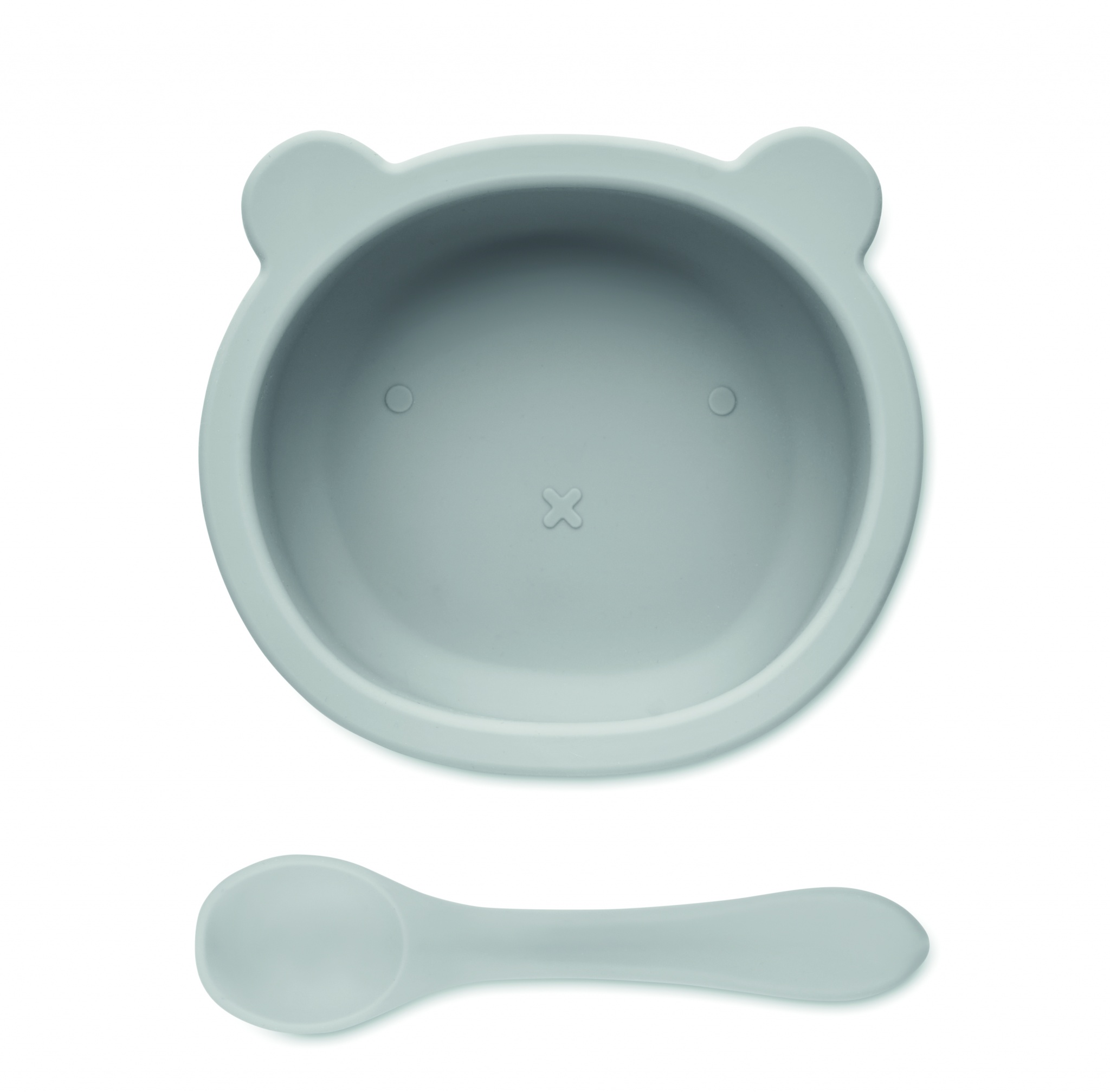 Silikoninen vauvasetti. Sisältää lusikan ja kulhon, jonka pohjassa on imukuppi.