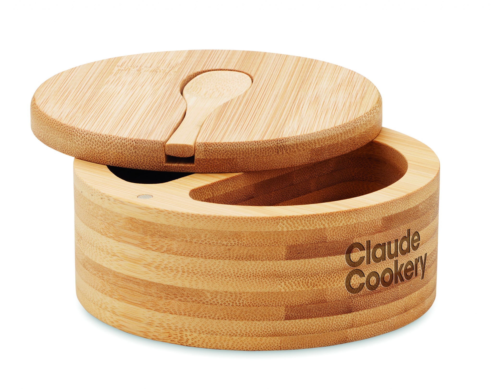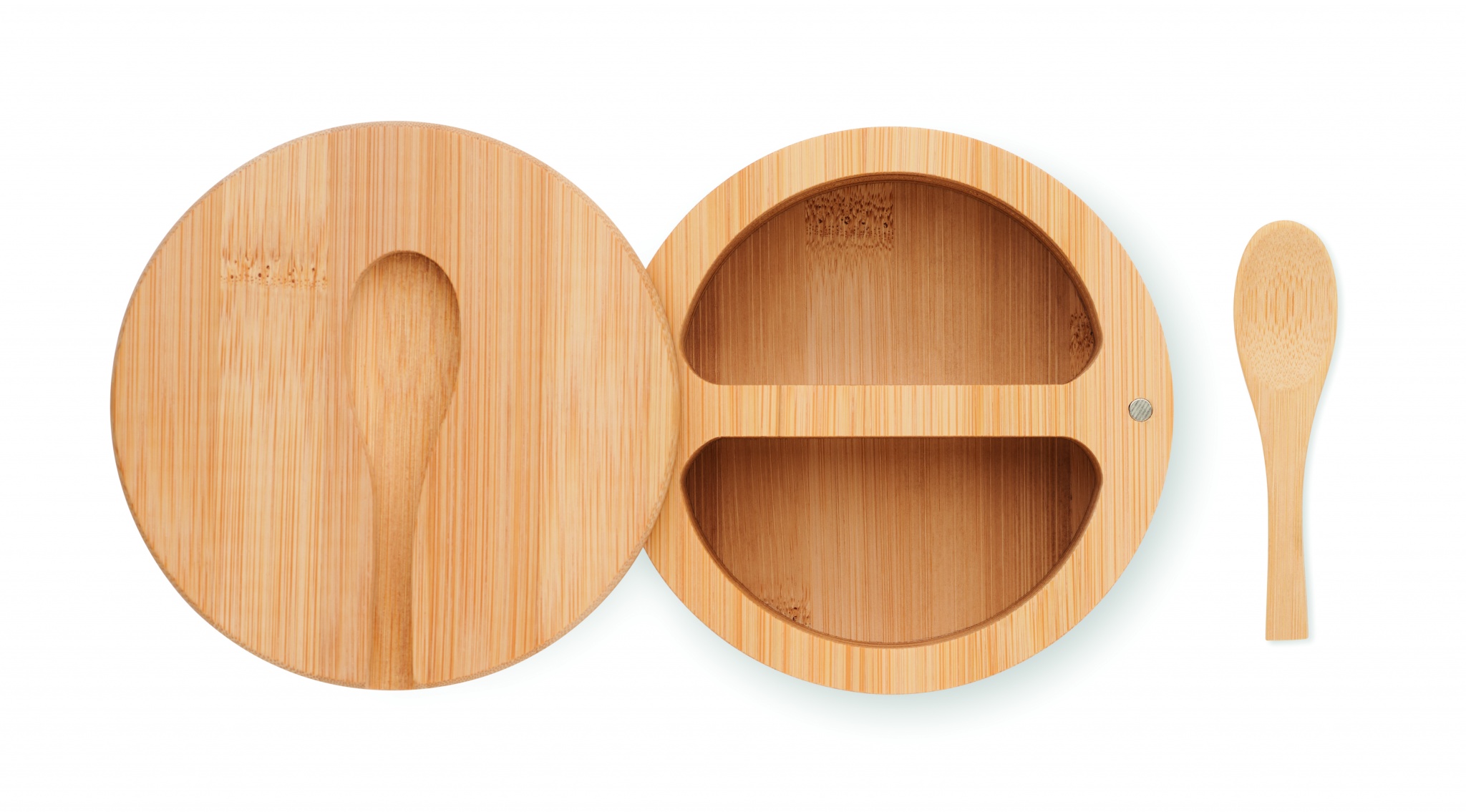 Suola- ja pippurirasia bambusta, jossa on sisäänrakennettu tarjoilulusikka. Kaksi lokeroa. Kierrettävä kansi. Bambu on luonnontuote, värissä ja koossa voi olla pieniä vaihteluita kappalekohtaisesti, mikä voi vaikuttaa lopulliseen koristelutulokseen.