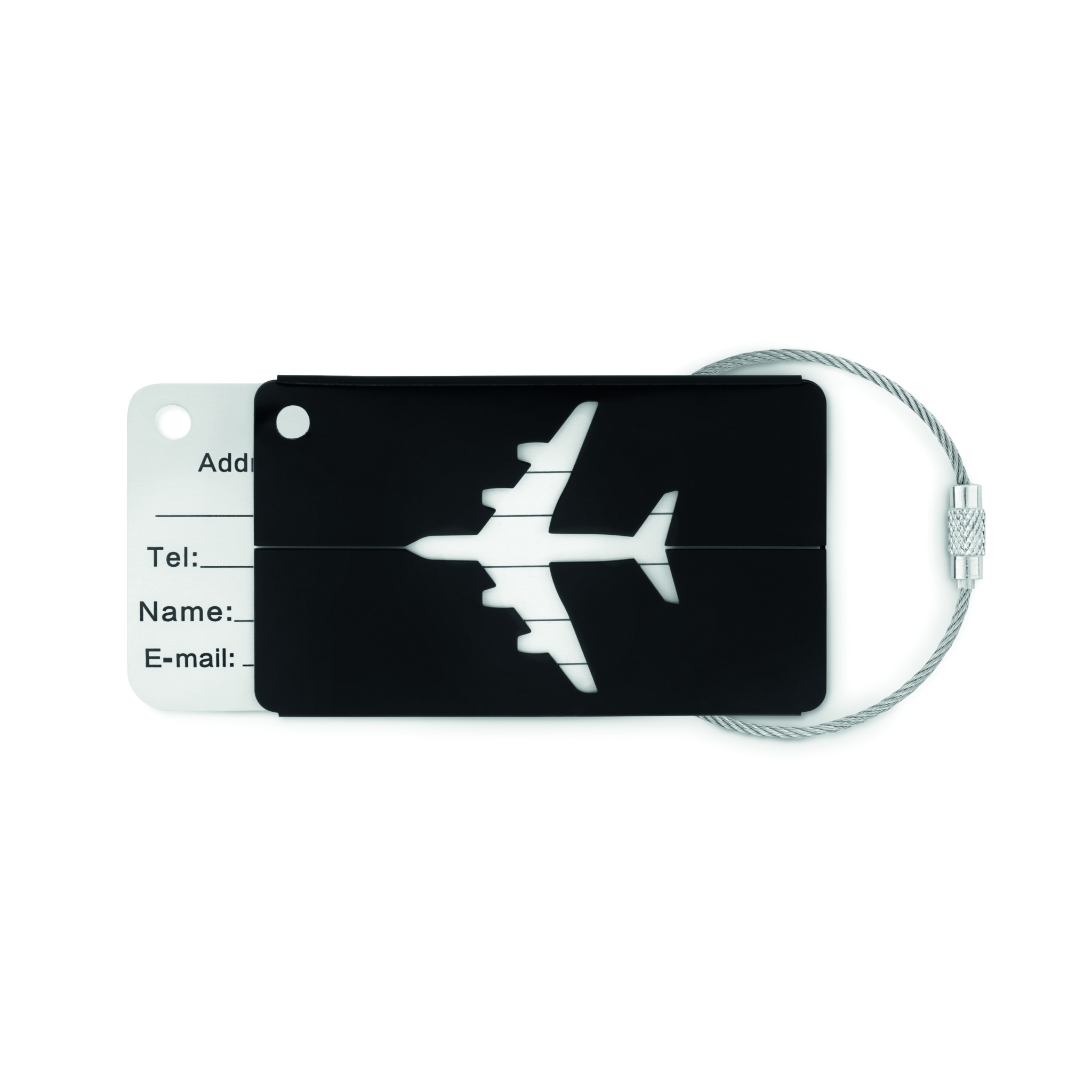 Aliumininė lėktuvo bagažo etiketė su pavadinimu ir adreso etikete. Komplektuojama su metaline virvele ir varžtu jungtimi.