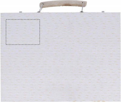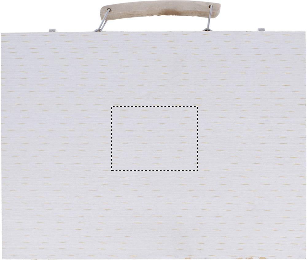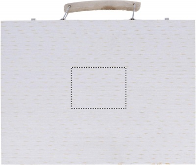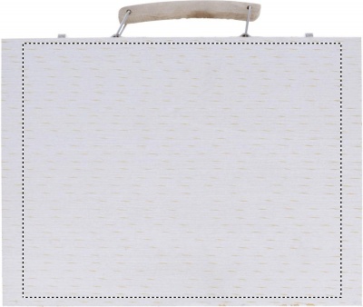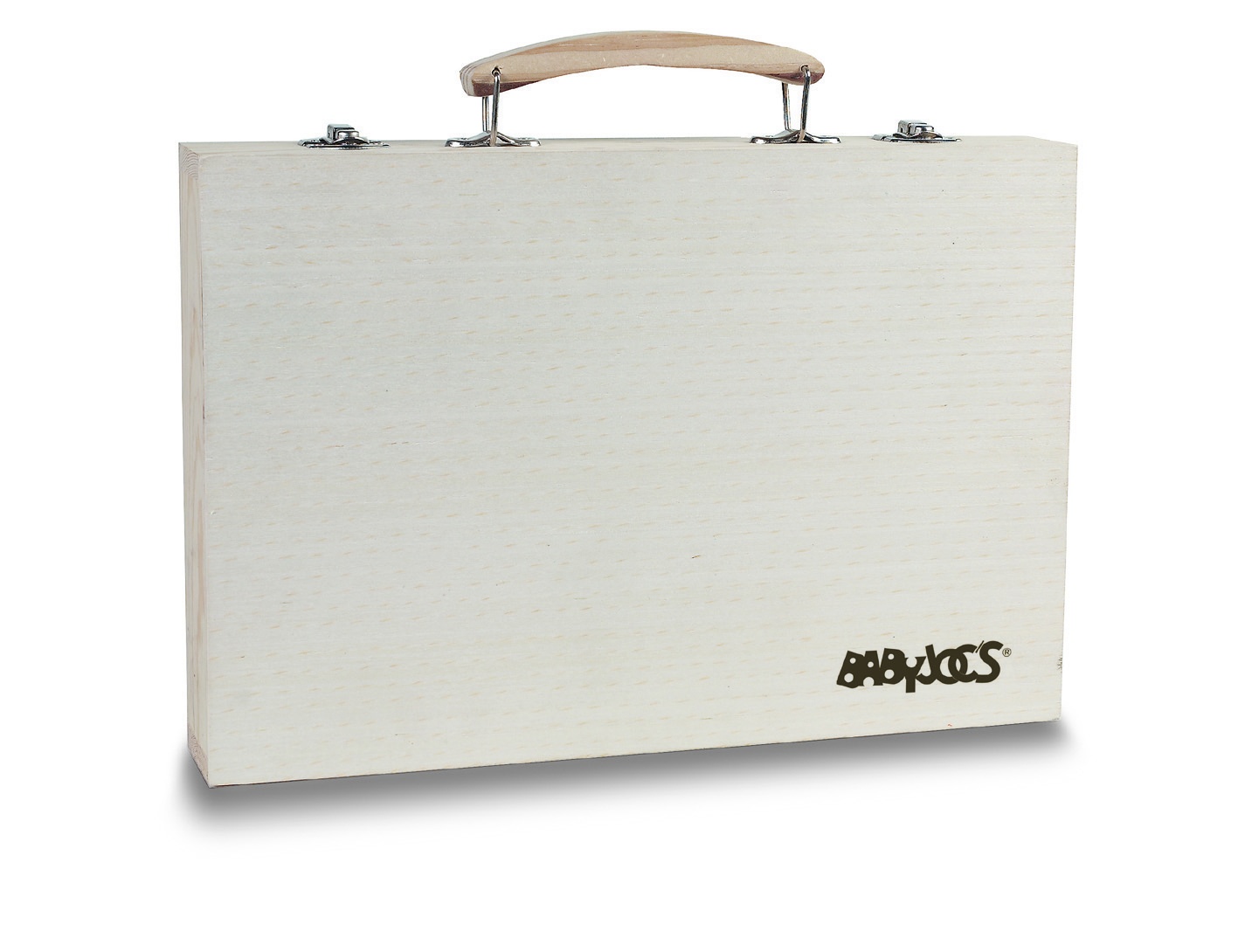 Menininko rinkinys medinėje dėžutėje, kurį sudaro 66 dalys (vaško kreidelės, aliejinės pastelės, žymekliai, spalvoti pieštukai, akvarelės, galąstuvas, klijai, trintukas, teptukas, liniuotė ir pieštukas).