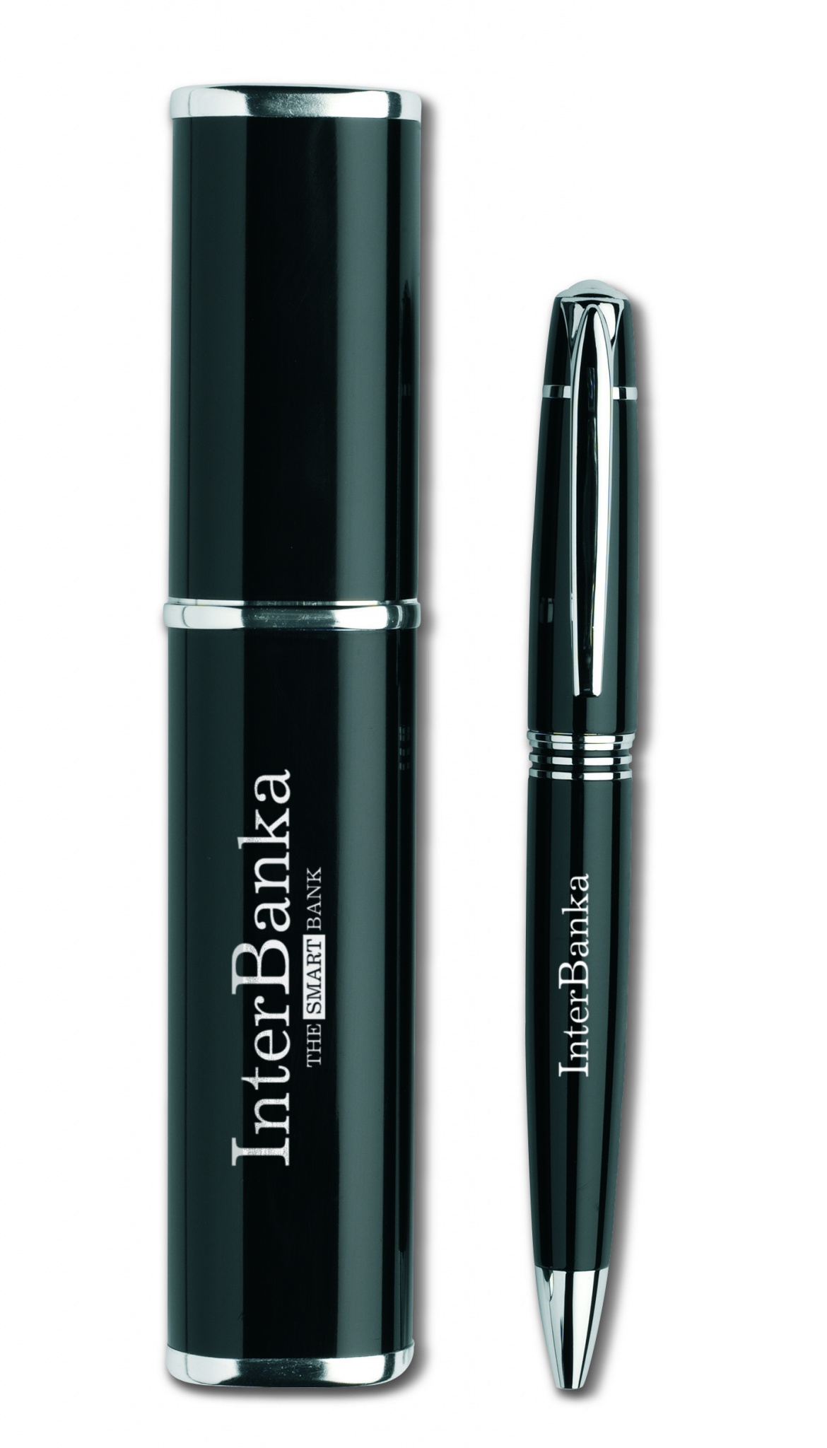 Metalinis sukamas rutulinis rašiklis aliuminio dovanų dėkle. Metalinis papildymas juodu rašalu.