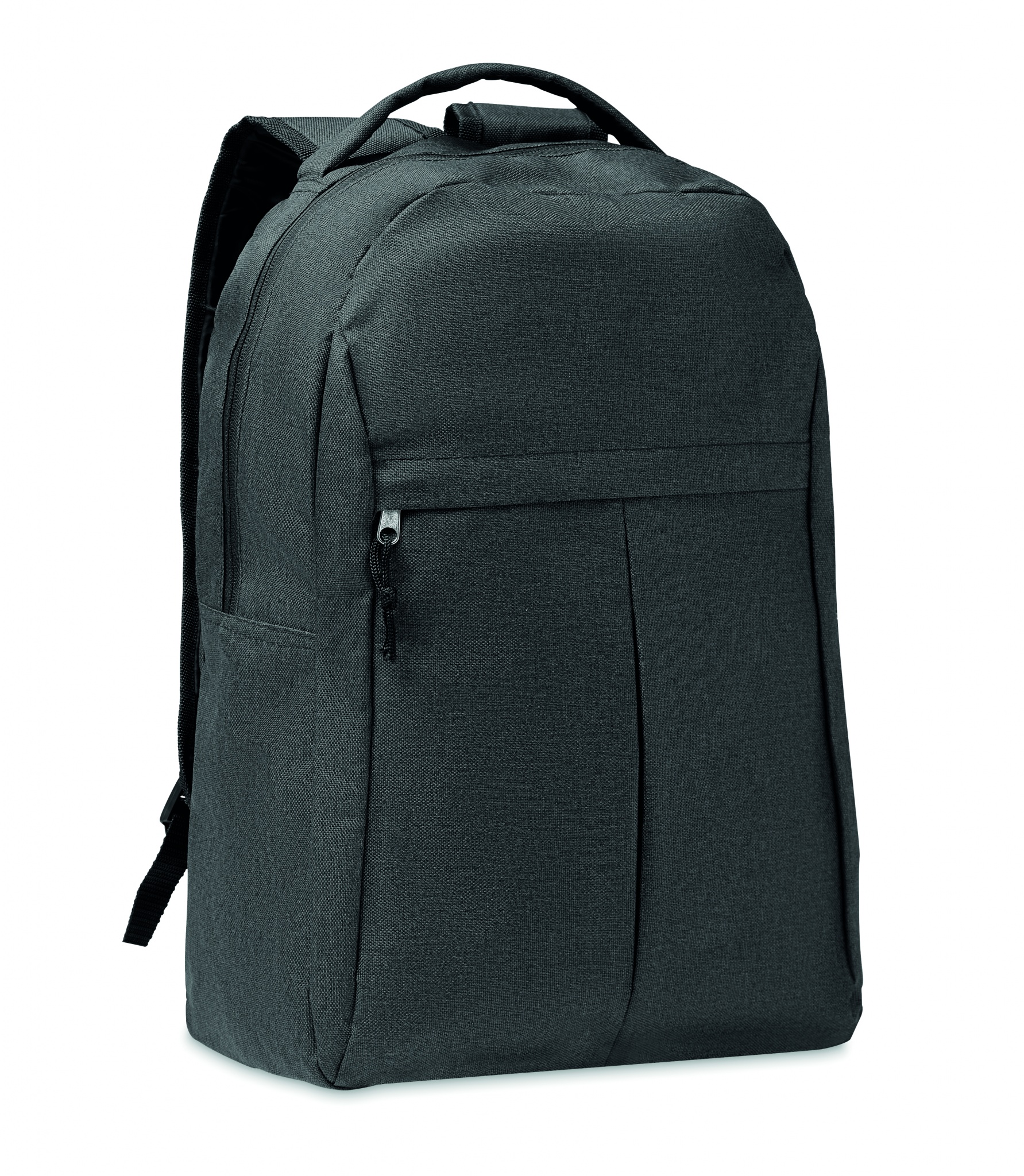 Mugursoma no 600D RPET 2 toņu poliestera ar ārējo kabatu ar rāvējslēdzēju un sieta kabatu sānos.