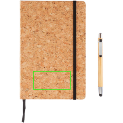 EKO piezīmju grāmatiņa izgatavota no dabīgā korķa ar 160 lapām 80g/m2 papīra. Ar melnu lapu dalītāju un melnu elastīgo joslu. Ietver bambusa pildspalvu ar irbuli un lodīšu galu.