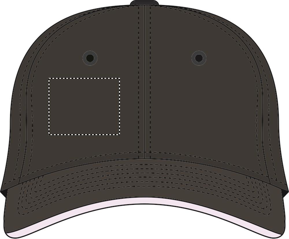 6 paneļu beisbola cepure no matētas smagas kokvilnas 270 gr/m2 ar regulējamu metāla sprādzi ar ievelkamu šķēlumu. Ar krāsainu sviestmaižu smaili. Izmērs 7 1/4.