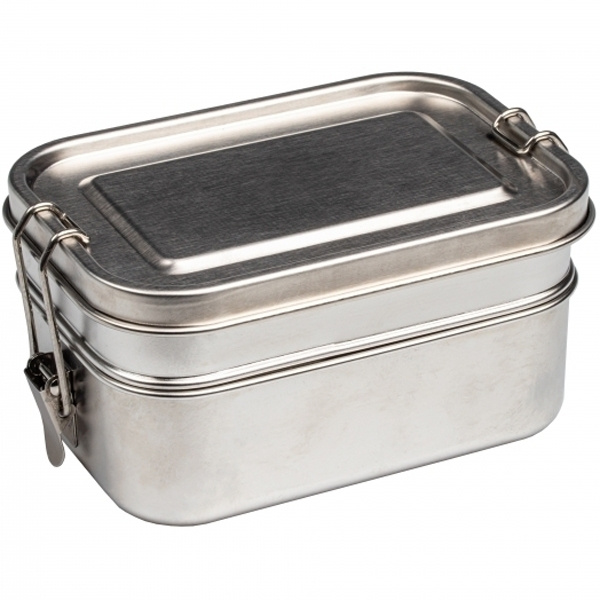 Двухъярусный, прочный, экологически чистый и надежный ланч-бокс (нижний объем 700 мл, верхний объем 450 мл) из нержавеющей стали с крышкой, которая закрывается зажимом с двух сторон. На крышке будет выгравирован ваш логотип.