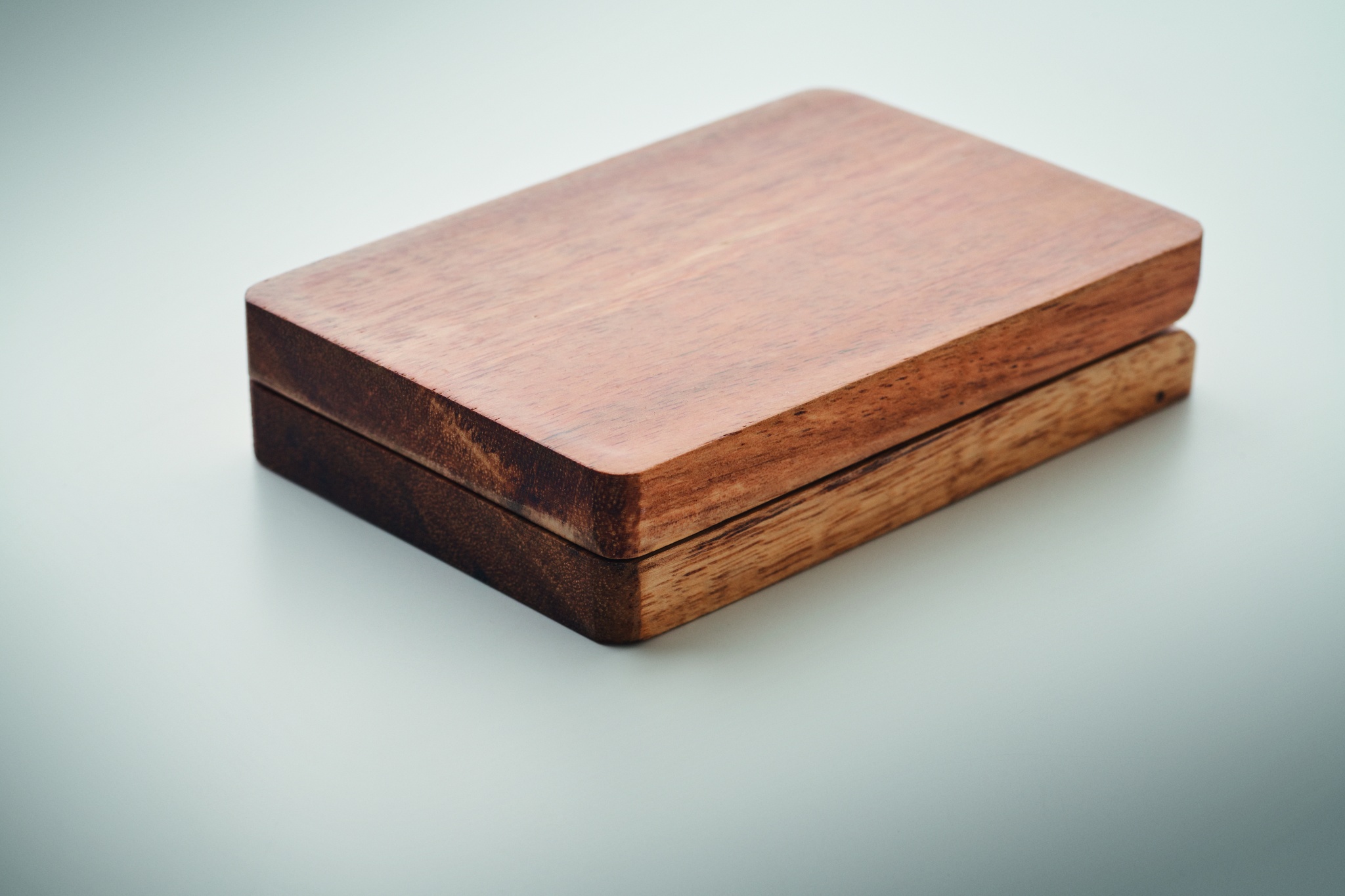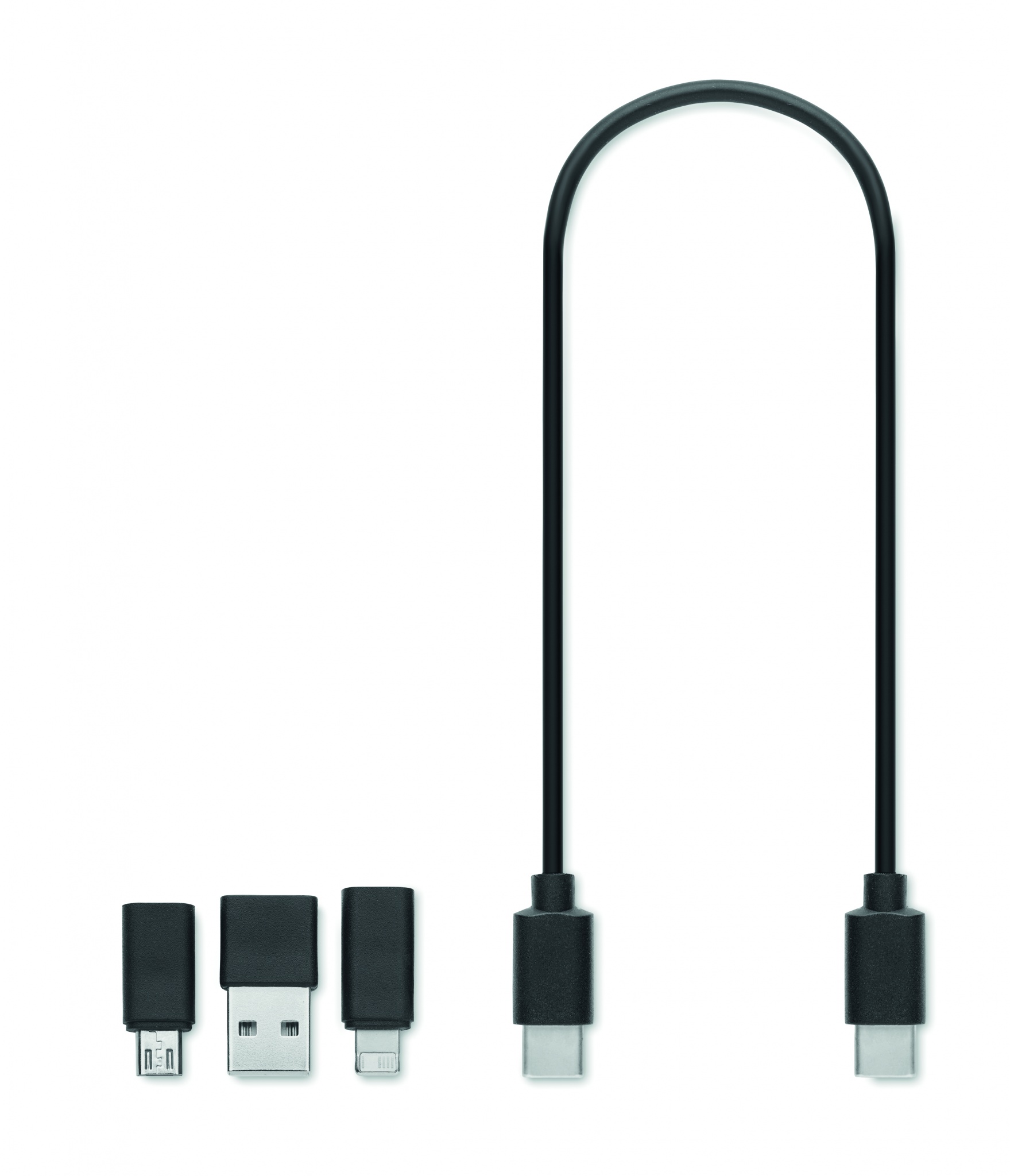 7-in-1 cable and connector set in bamboo case with magnetic closure and wrist strap. Data transfer and power transmission cable (480 Mbps): Type-C to Type-C. Adapters: Type-C to Type-A, Type-C connectors.