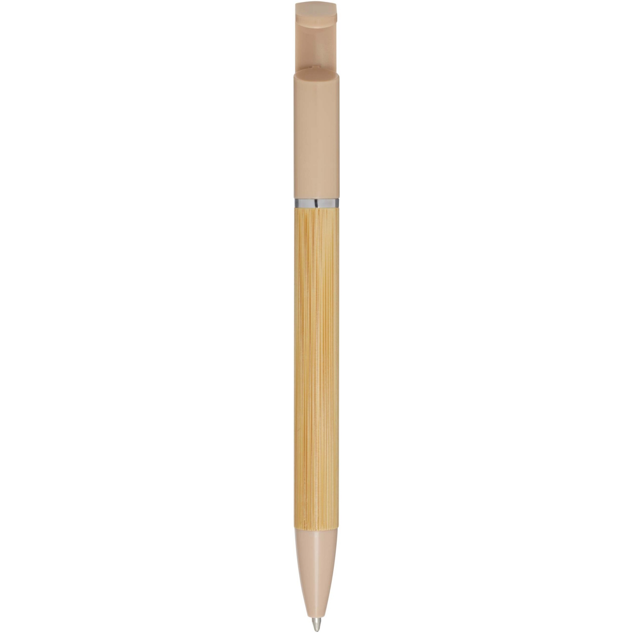 Бамбуковая шариковая ручка, которая также может служить подставкой для телефона. Кнопка и среднее кольцо изготовлены из переработанного пластика, наконечник — из латуни, а корпус — из бамбука, полученного из ответственных источников. Цвет чернил: черный. Длина непрерывной линии: 1000 метров. Размер пера: 1,0 мм.