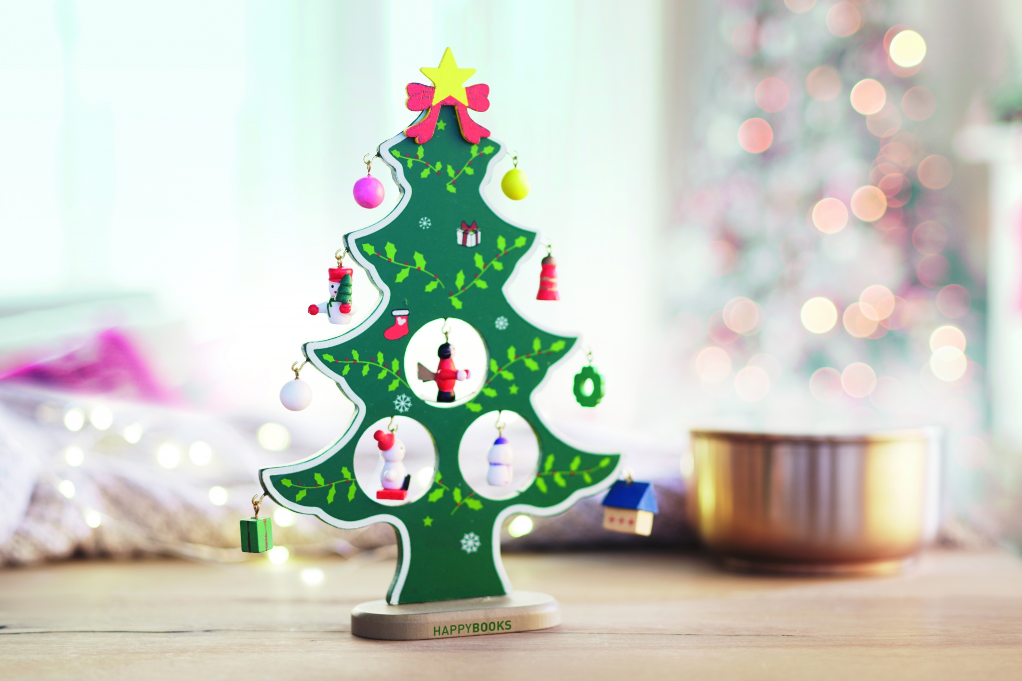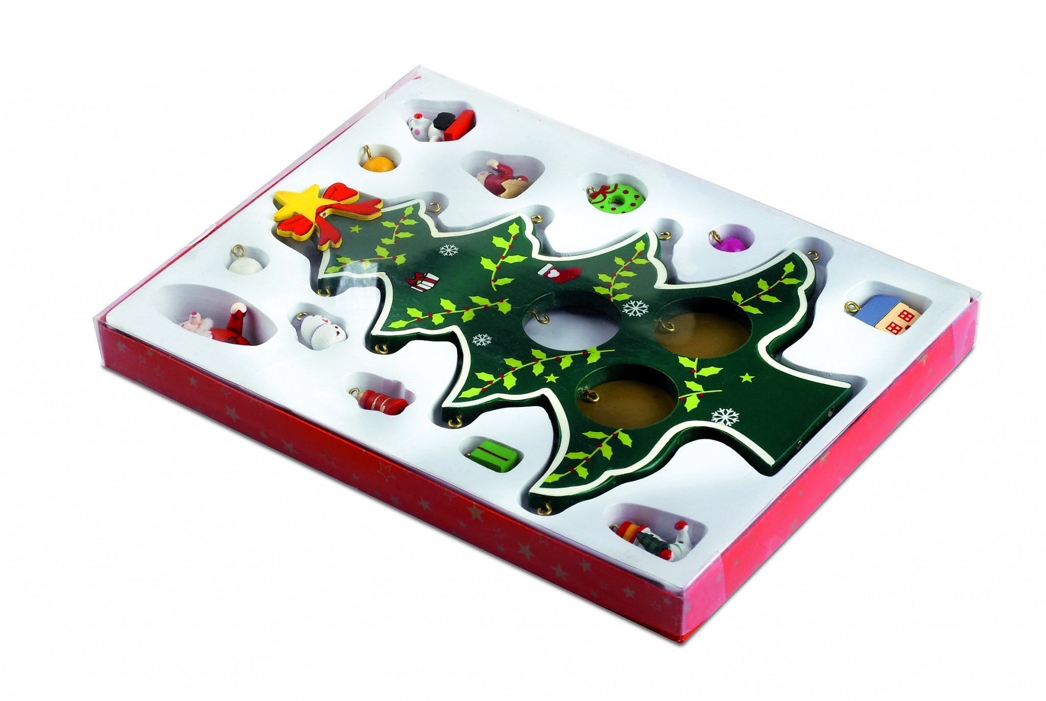 Деревянная новогодняя ёлка с 12 различными ёлочными украшениями. Индивидуальная упаковка с прозрачной крышкой.