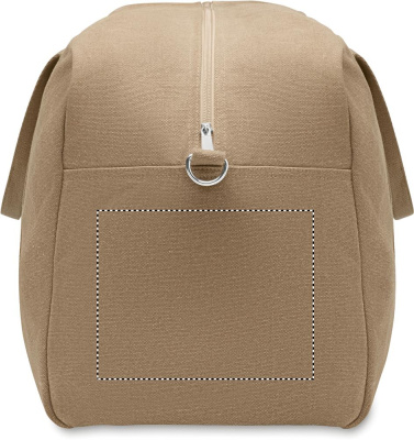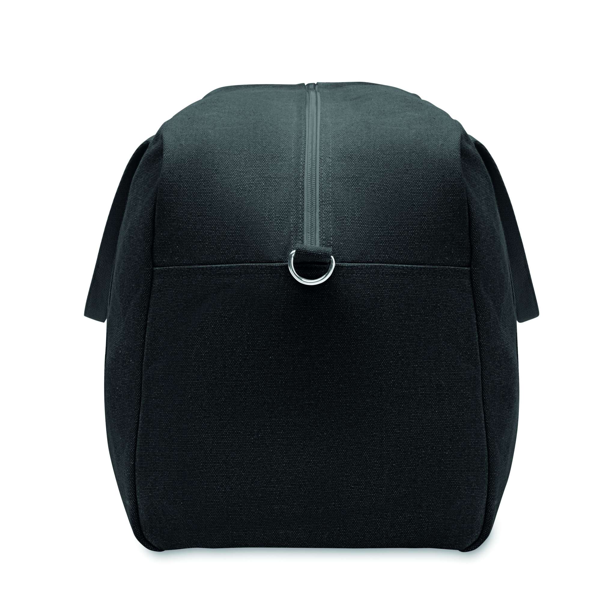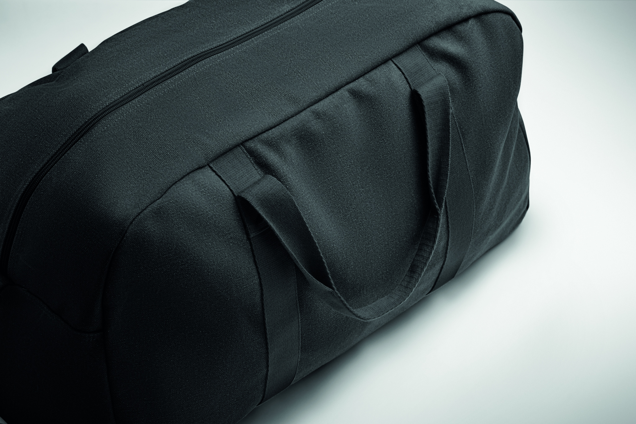 Duffle travel bag in recycled 450 gr/m² fabrics (60% recycled cotton and 40% recycled polyester) with adjustable and detachable cotton strap.