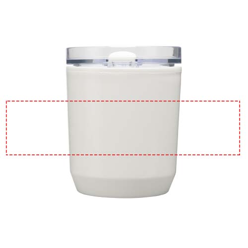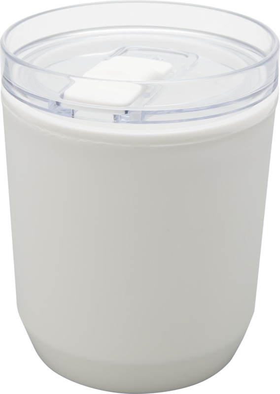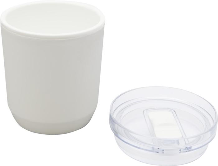 Кружка с простым дизайном, подходящая для большинства кофемашин и автомобильных подстаканников. Имеет двойную конструкцию из переработанного пластика PP снаружи и пластика PP внутри. Раздвижная крышка изготовлена из пластика AS и PP. Объем: 180 мл.
