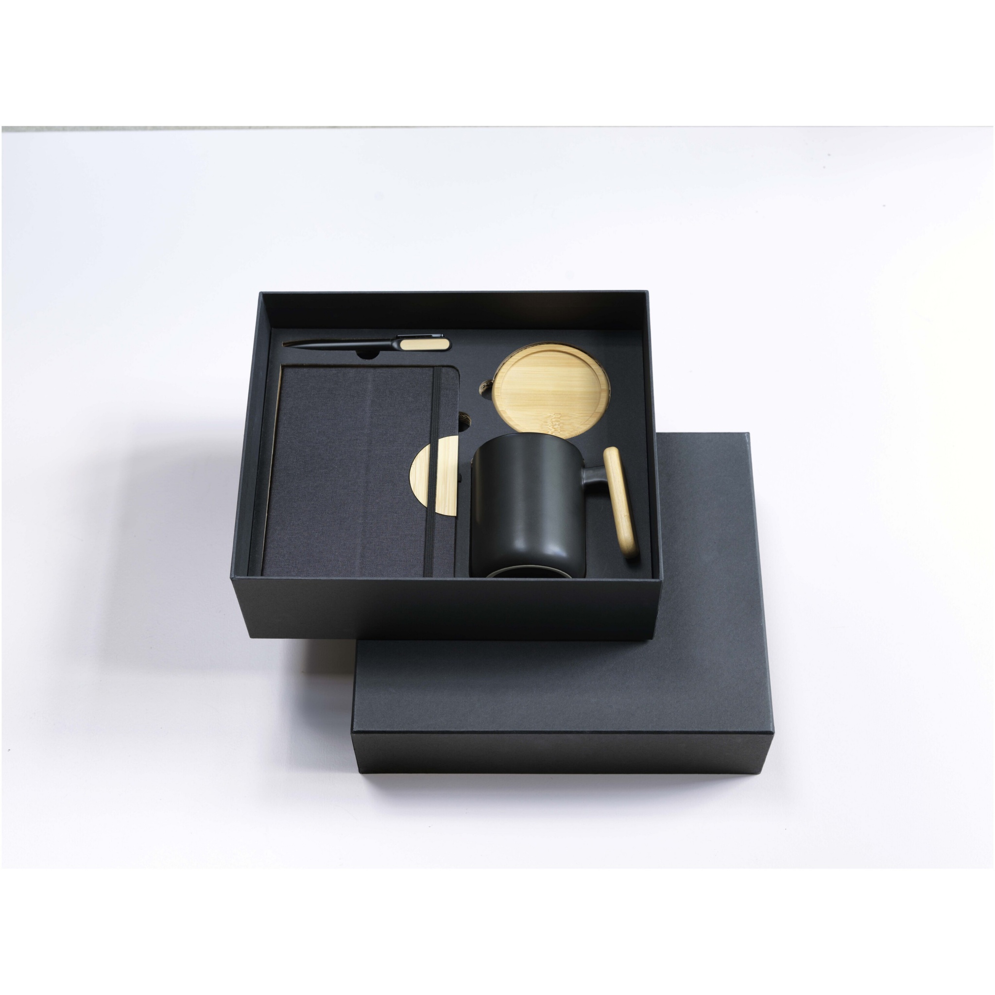 В подарочный набор Laura входит блокнот в твердой обложке RPET формата A5, шариковая ручка, керамическая кружка и подставка. Блокнот имеет черную эластичную застежку и ленточную закладку, а также 80 разлинованных листов бумаги плотностью 80 г/м² кремового цвета. Чехол для ноутбука вместе с бамбуковым полукругом выполняет функцию подставки для телефона. Шариковая ручка изготовлена из переработанного алюминия, сертифицированного RCS, с черным напылением и имеет бамбуковые аксессуары с обеих сторон верхнего корпуса. Чернила для ручки: черный. Длина непрерывной линии: 400 метров. Керамическая кружка объемом 480 мл поставляется с бамбуковой подставкой. Мыть только вручную. Размер кружки: 11 х 12,7 см. Диаметр подставки: 9,5 см. Размер подарочной коробки: 32 x 27 x 10,3 см.