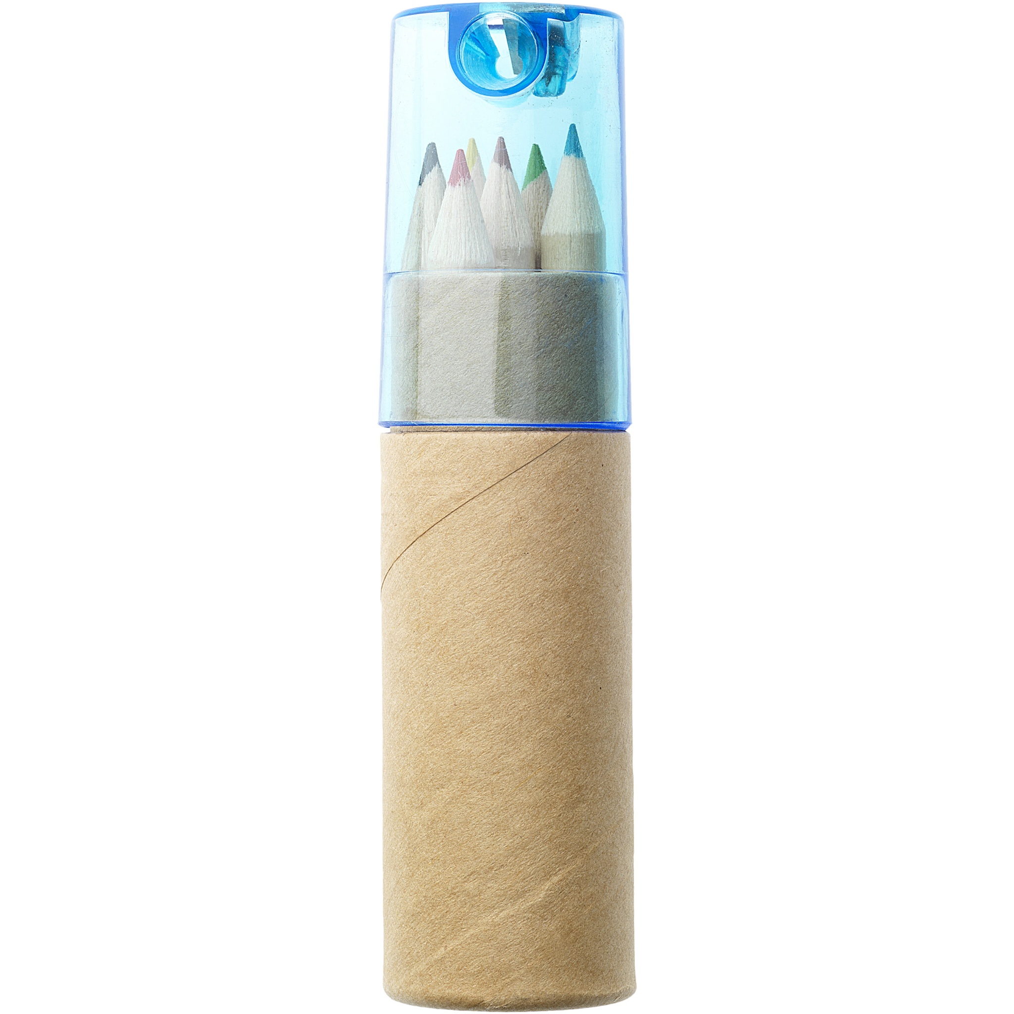 6 цветных карандашей в картонной цилиндрической коробке с точилкой в пластиковом корпусе. Нанесение не предлагается на отдельные элементы набора.