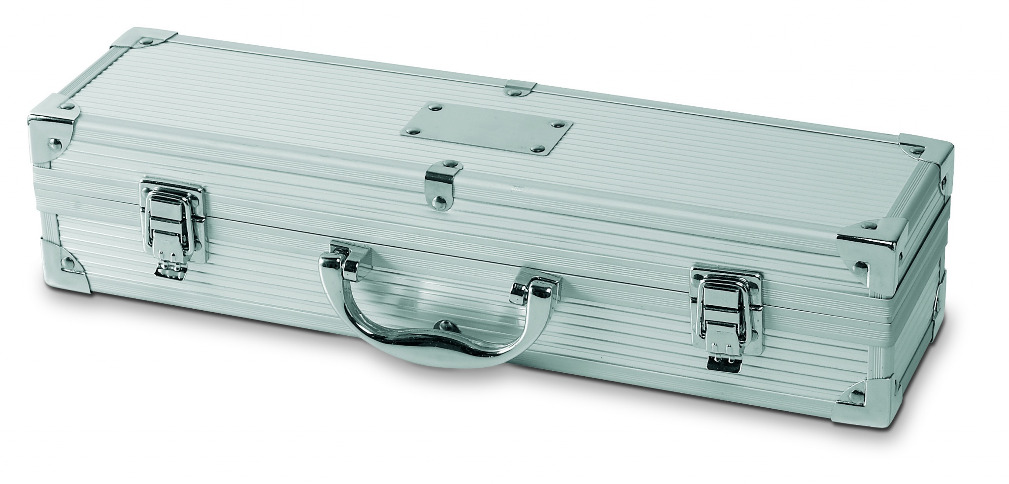 Алюминиевый чемоданчик с 3 приборами из нержавеющей стали для барбекю. Для нанесения логотипа предлагается специальная пластина.