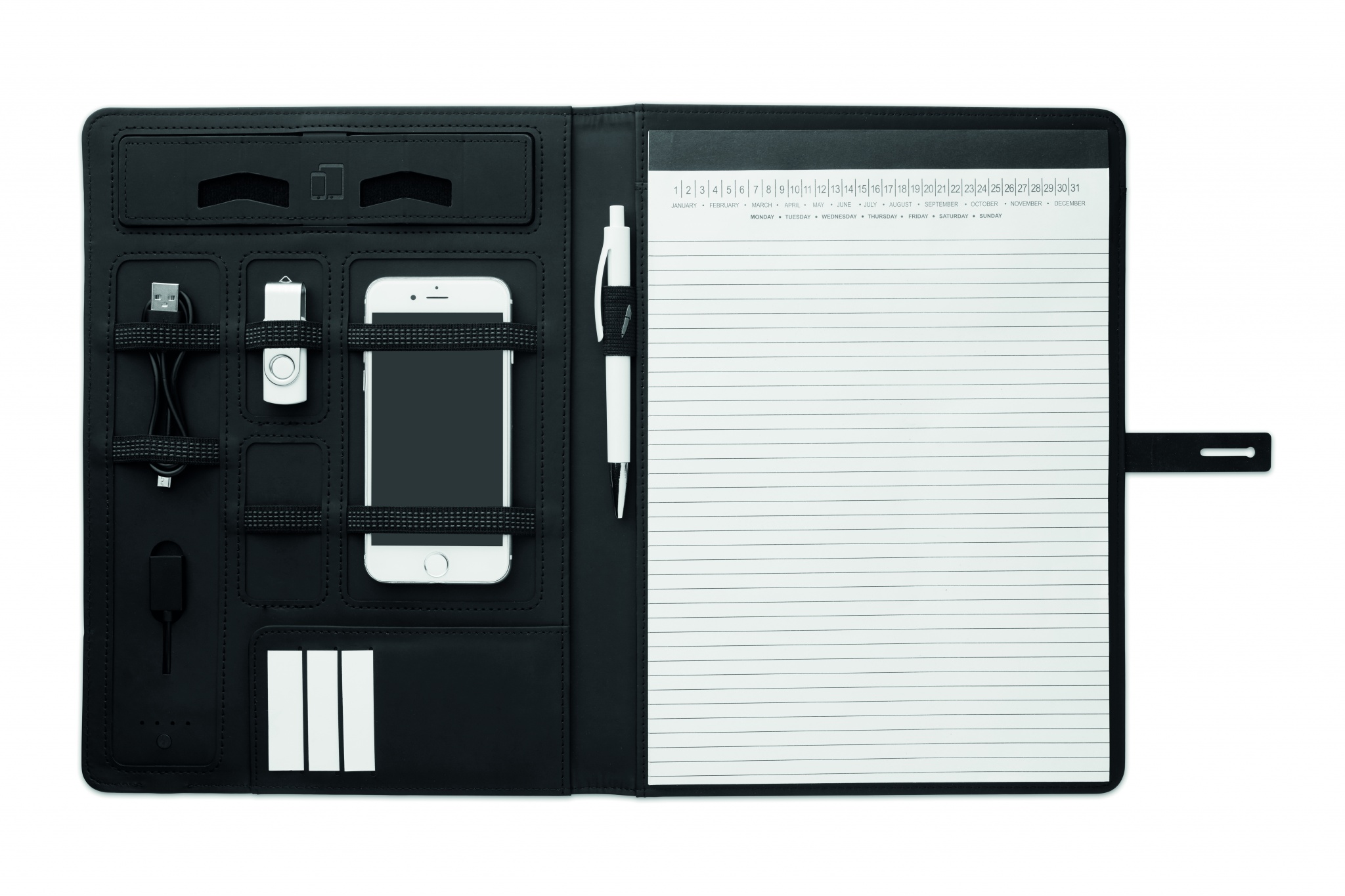 Конференц папка A4 с тканевой отделкой на застежке. Внутри беспроводная зарядка DC5V / 1A и аккумулятор 4000 мАч. В комплекте микро-USB с разъемом тип C. Есть блокнот для записей на 20 стр. Множество кармашков.