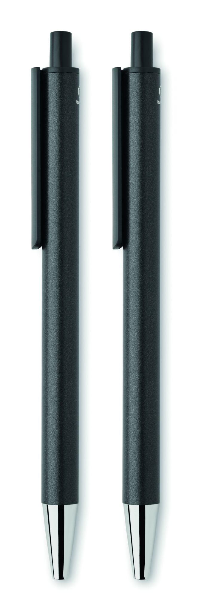 Recycled aluminium pen set with 1 push button ball pen and 1 graphite inkless pen. Blue ink. Presented in recycled paper box.