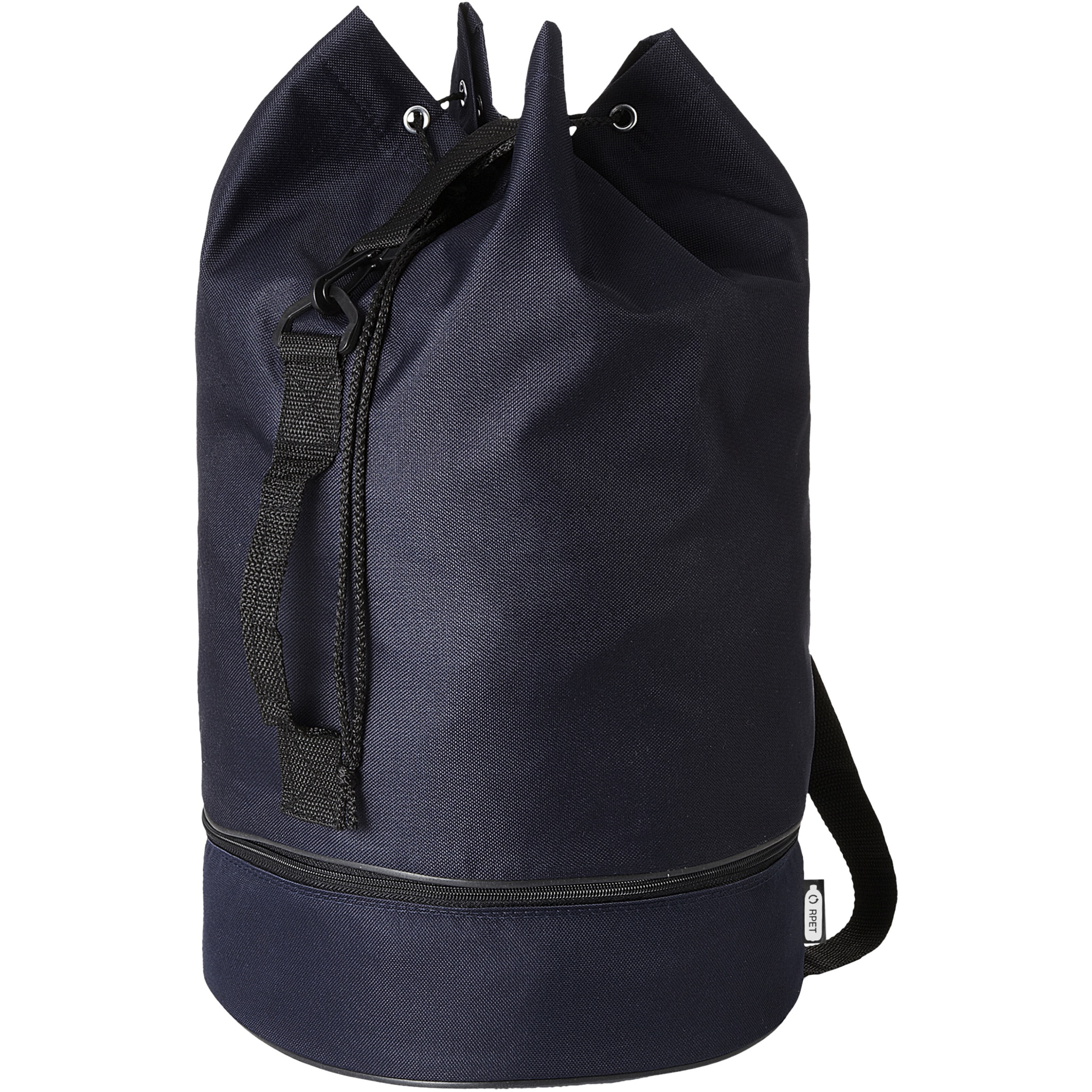 Водонепроницаемый спортивный вещмешок из переработанного РЕТ-пластика с вместительным 20 основным отделением объемом 20 литров, застежкой на шнурке, боковой ручкой и регулируемым плечевым ремнем. Также имеет отдельное нижнее отделение на молнии для небольших предметов.