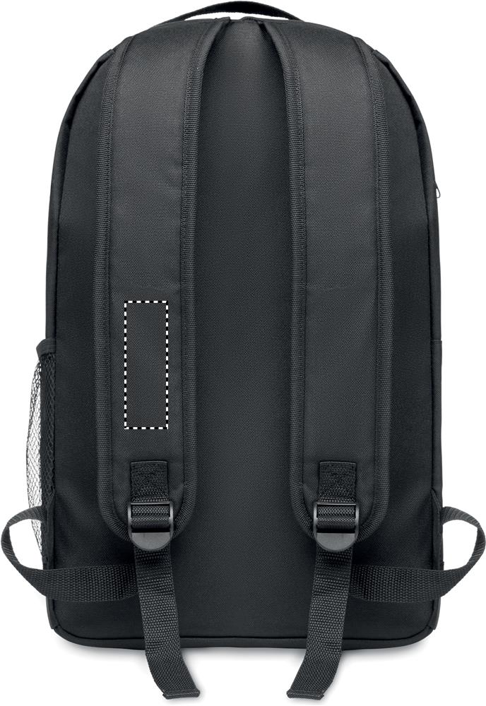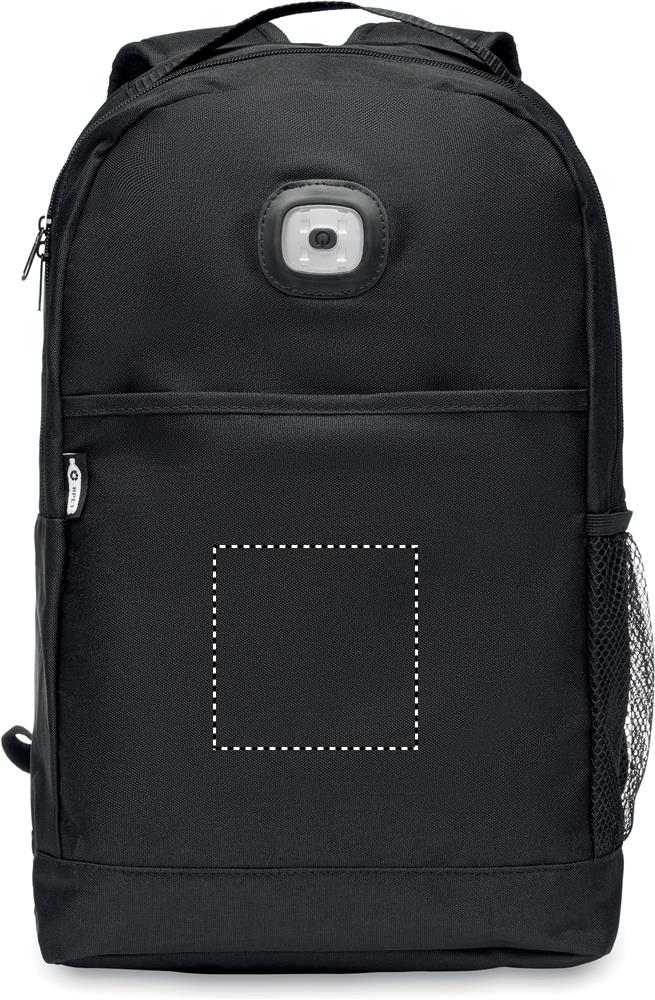 Рюкзак из 600D RPET со съемным фонариком спереди. Передний карман на липучке. Сетчатый карман на боку. Батарейка включена.