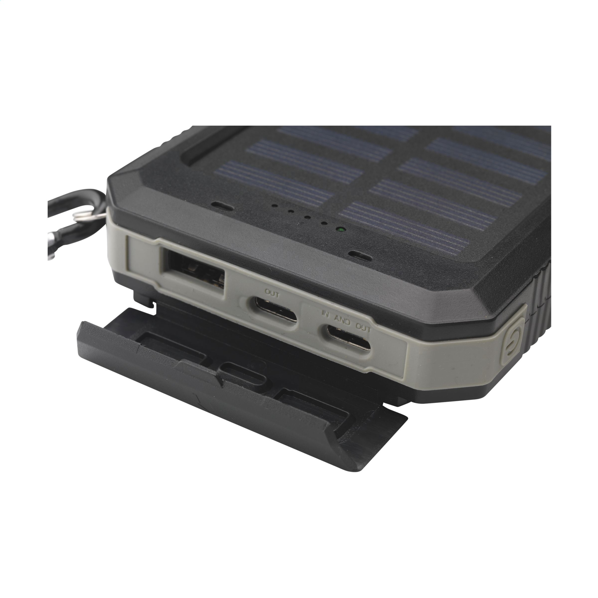 Прочный внешний аккумулятор емкостью 8000 мАч с корпусом из переработанного АБС-пластика с защитными силиконовыми бортиками по углам. Имеет солнечную панель, встроенный компас, светодиодные индикаторы, светодиодный фонарик и карабин. Защита от брызг и пыли. Подходит для зарядки большинства распространенных смартфонов и других устройств. Вход: Type-C DC5V/2.1A. Выход: Type-C DC5V/2.1A. 1 порт USB-A и 2 порта USB-C. Входная солнечная батарея: 200 мАч. Время зарядки от солнечной батареи около 40 часов. Можно заряжать от сети или солнечной панели. Идеальное универсальное зарядное устройство для активного отдыха. В комплект входит кабель для зарядки USB-C/USB-C и руководство пользователя. Сертифицировано RCS. Общее количество переработанных материалов: 17%. Каждый предмет упакован в индивидуальную коробку.