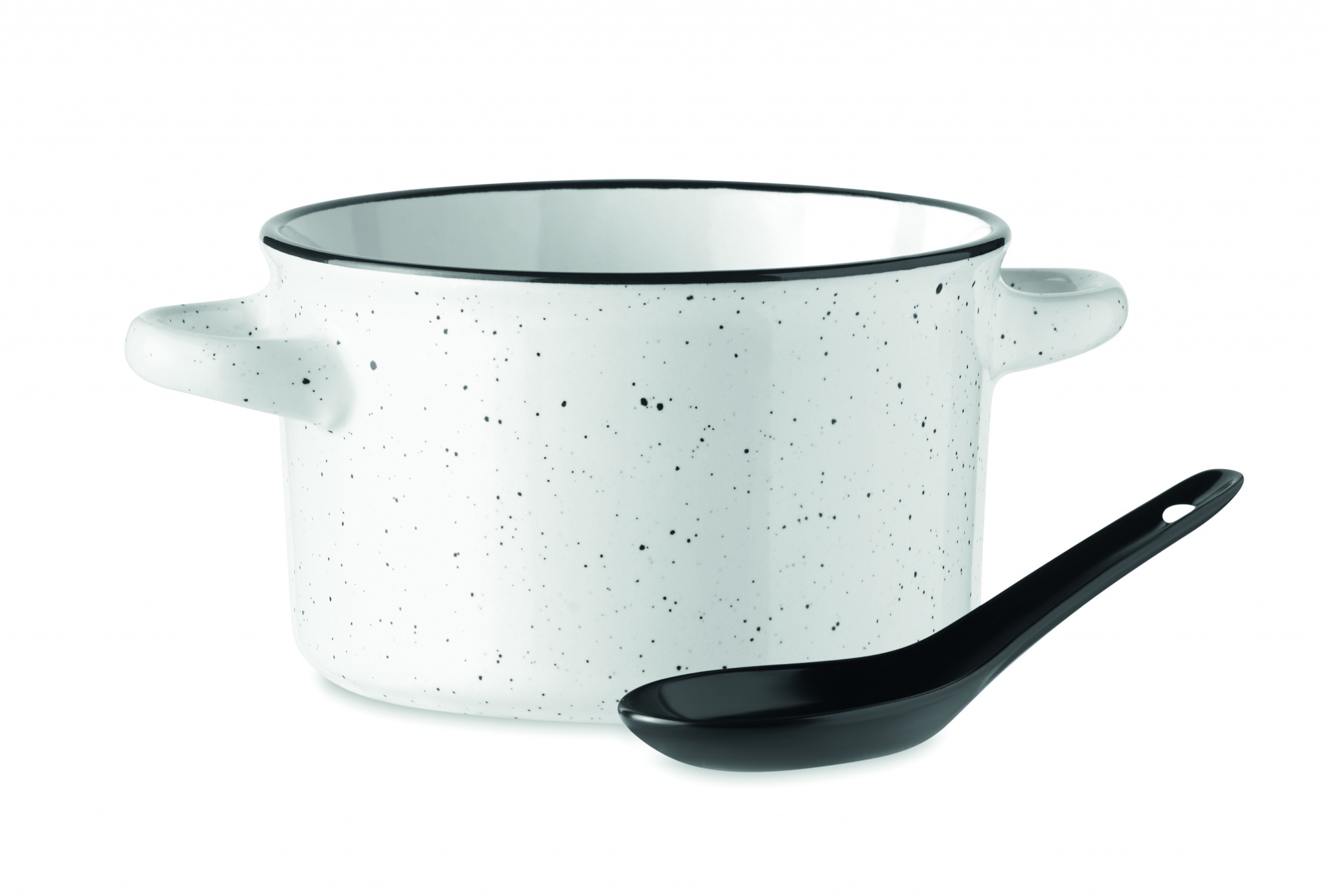 Керамическая суповая миска в винтажном стиле с ложкой. Из-за пятнистой поверхности изделия на логотипе также возможны затемнения в местах пятен. Объем: 550 мл.