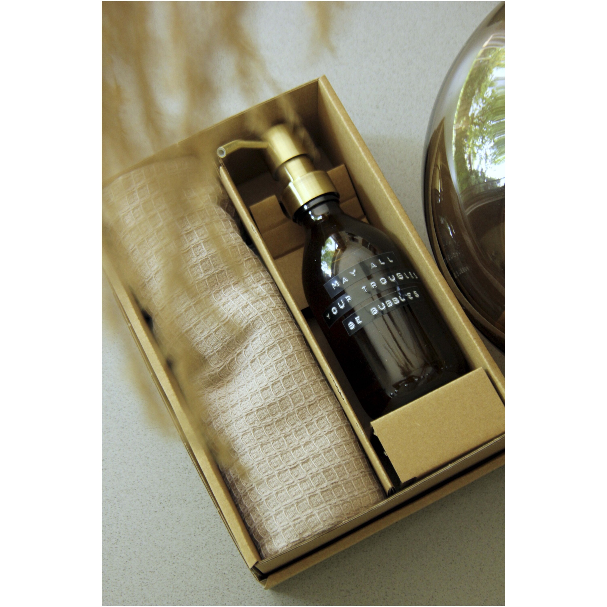 Подарочный набор, включающий в себя мыло для рук с ароматом бамбука объемом 250 мл и бежевое кухонное полотенце из органического хлопка. Этот набор отлично подойдет в качестве подарка по любому поводу.