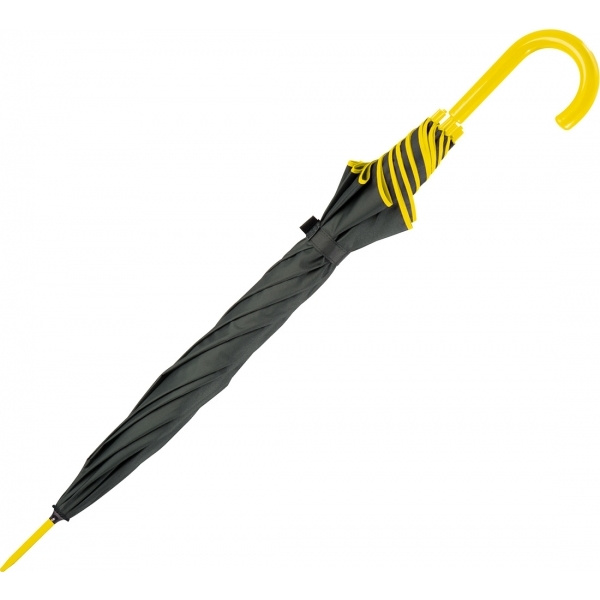 Автоматический зонт из эпонжа 190T со стекловолоконными стойками, пластиковой ручкой, цветным ободом, ручкой и рамой. Мы печатаем ваш логотип на одном сегменте.