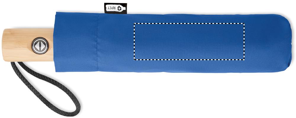 23-tums paraply i 190T pongee RPET och 3-delat skaft med automatisk öppning och stängning. Skydda dig från regnet med detta snygga paraply. På grund av fiberglasribborna är detta paraply stormsäkert, starkt men ändå lätt. Bambuhandtaget ger det ett naturligt utseende och bomullsremmen håller den hängande på din handled. Paraplyet är tillverkat av återvunnet PET-material. Precis som den matchande RPET-fodralet där du kan förvara paraplyet. Bambu är ett naturligt material och det kan finnas små variationer i färg och storlek per artikel, vilket kan påverka det slutliga märkresultatet.