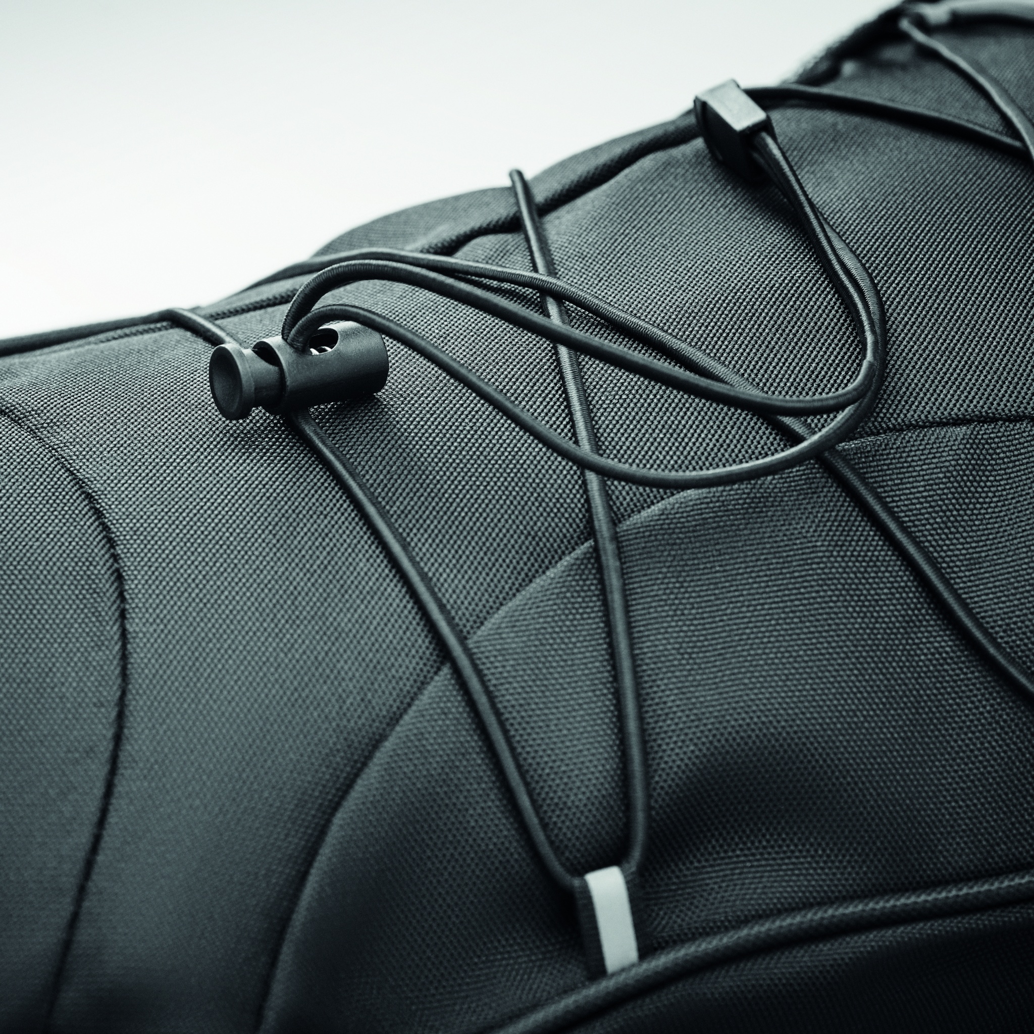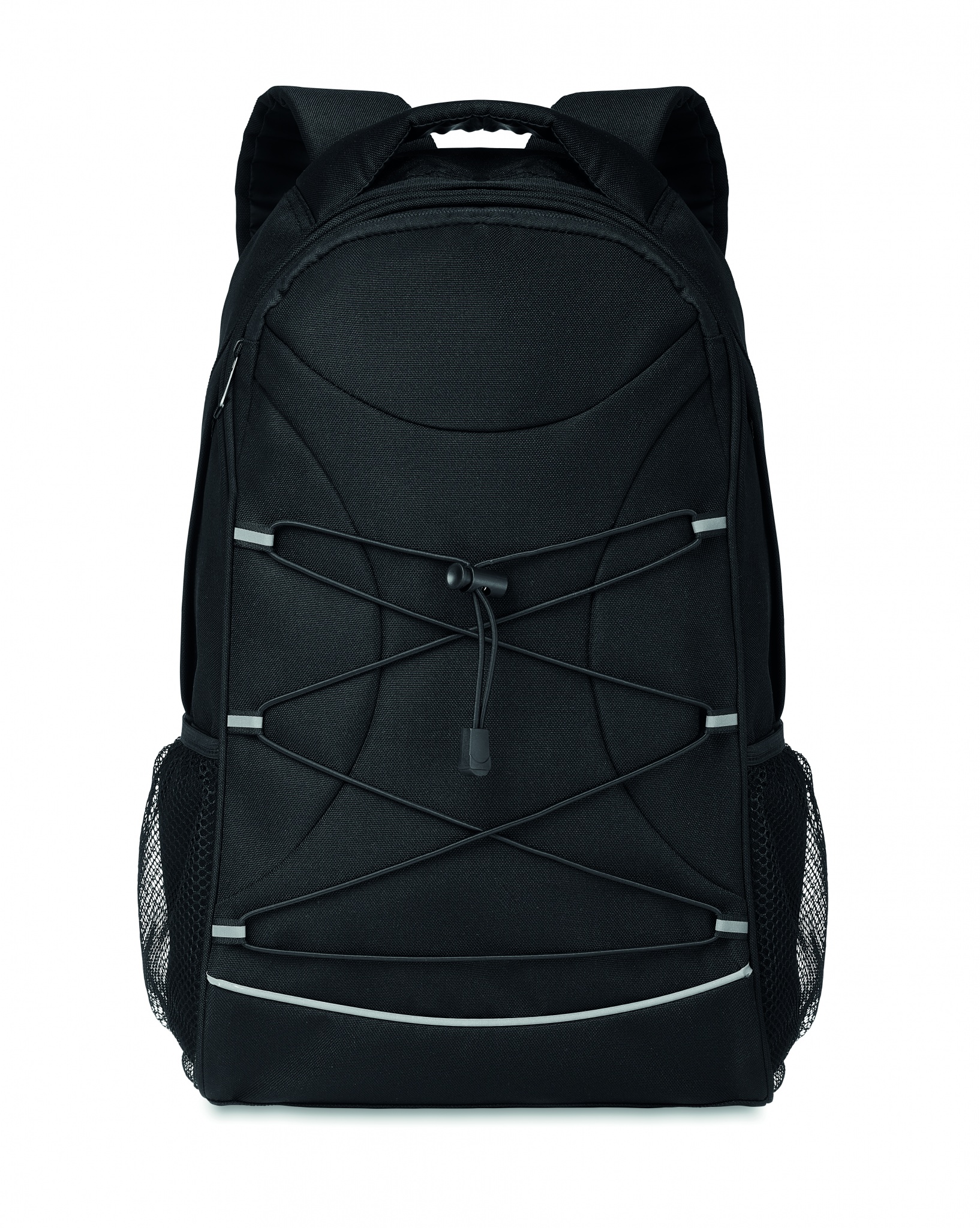 Ryggsäck i 600D RPET med mörka snören fram och reflexdetaljer på framsidan. Meshfickor på båda sidor.