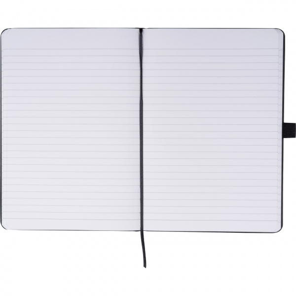 A5-anteckningsbok med PU-omslag, bokmärke, elastiskt band, pennögla och 120 linjerade sidor tillverkade av stenpapper. Detta specialpapper är tillverkat av kalciumkarbonat och är olje- och vattenbeständigt, antistatiskt, icke-kornigt, flamskyddat och viktigast av allt, rivbeständigt. Din logotyp är tryckt på utsidan av omslaget.