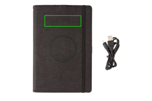 Påfyllningsbart omslag för anteckningsbok med 5W trådlös laddning. Omslaget är tillverkat i polyester och har ett elastiskt band. Anteckningsboken på insidan har ett svart PU cover och har 80 blad/160 sidor linjerat cremefärgat papper, 70gr/m2. 80 cm micro USB kabel medföljer. Input: 5.0V/2.0 A. Output: 5.0V/1A. Registrerad design®