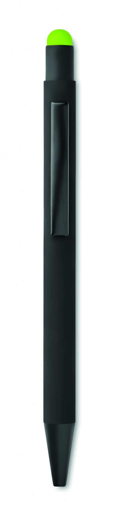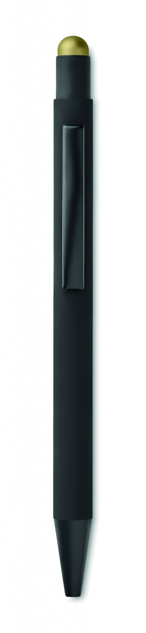 Aluminium penna med gummerad lackad yta och tryck funktion. Skaftet har under den svarta färgen motsvarande färg som touch toppen vilket gör att märkningen vid lasergravering får motsvarande färg. Blått bläck i patronen.