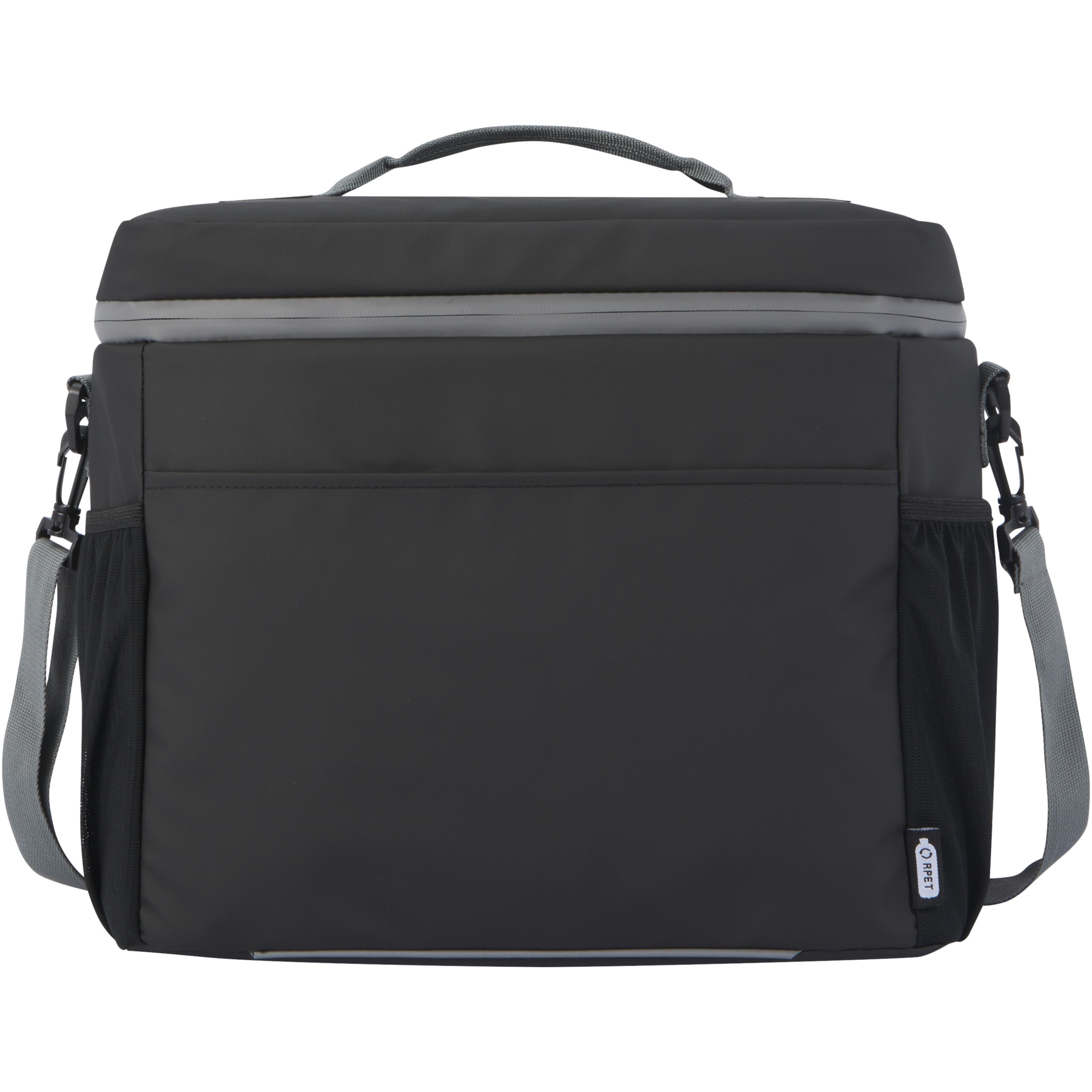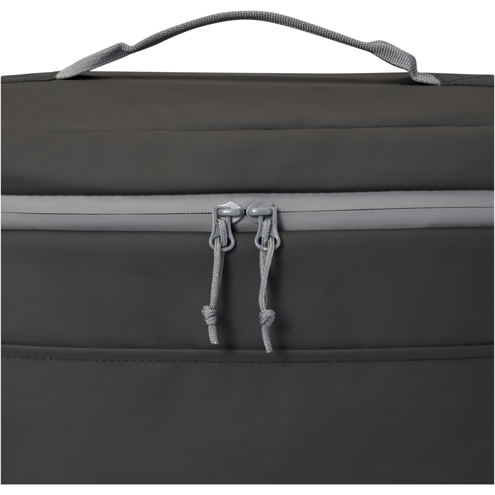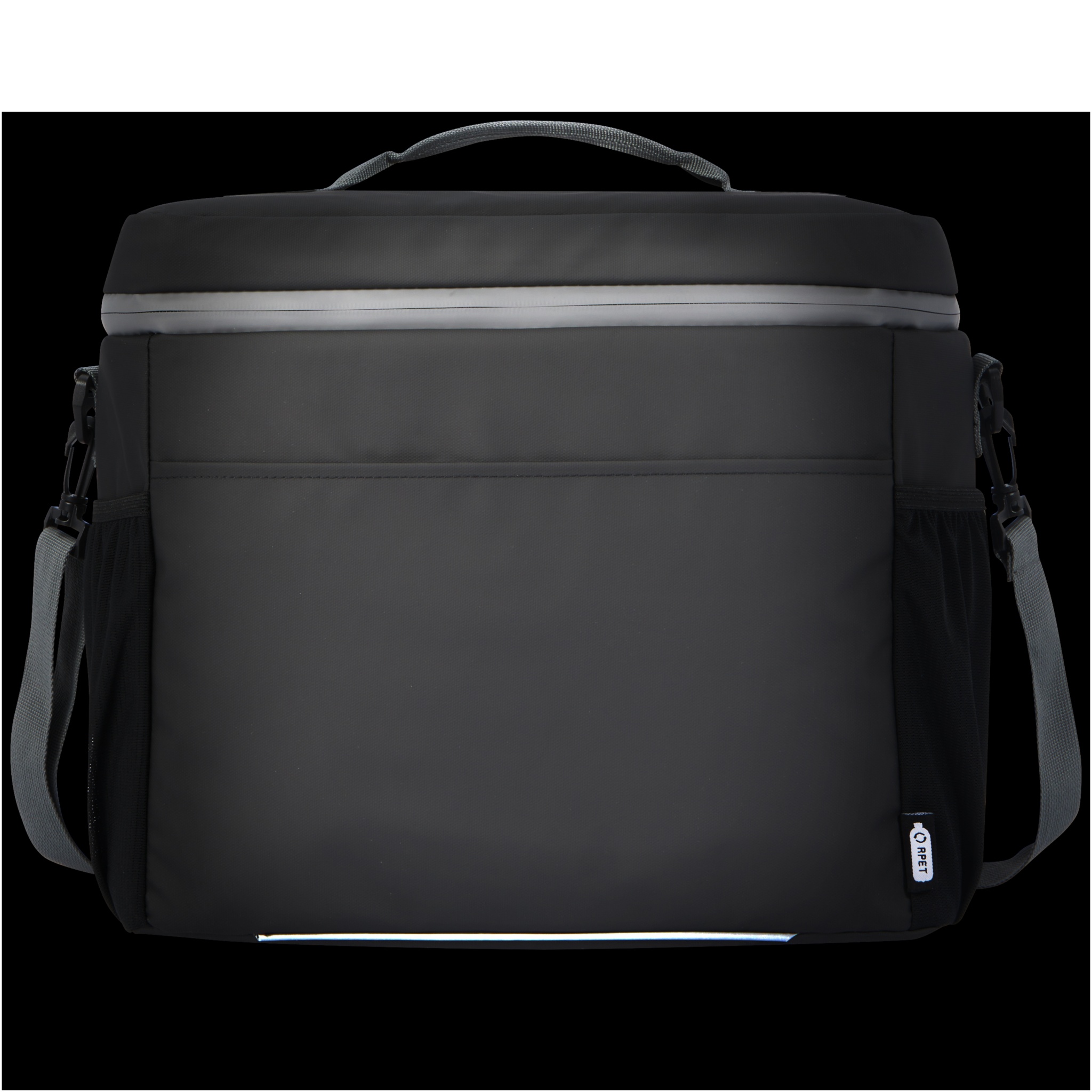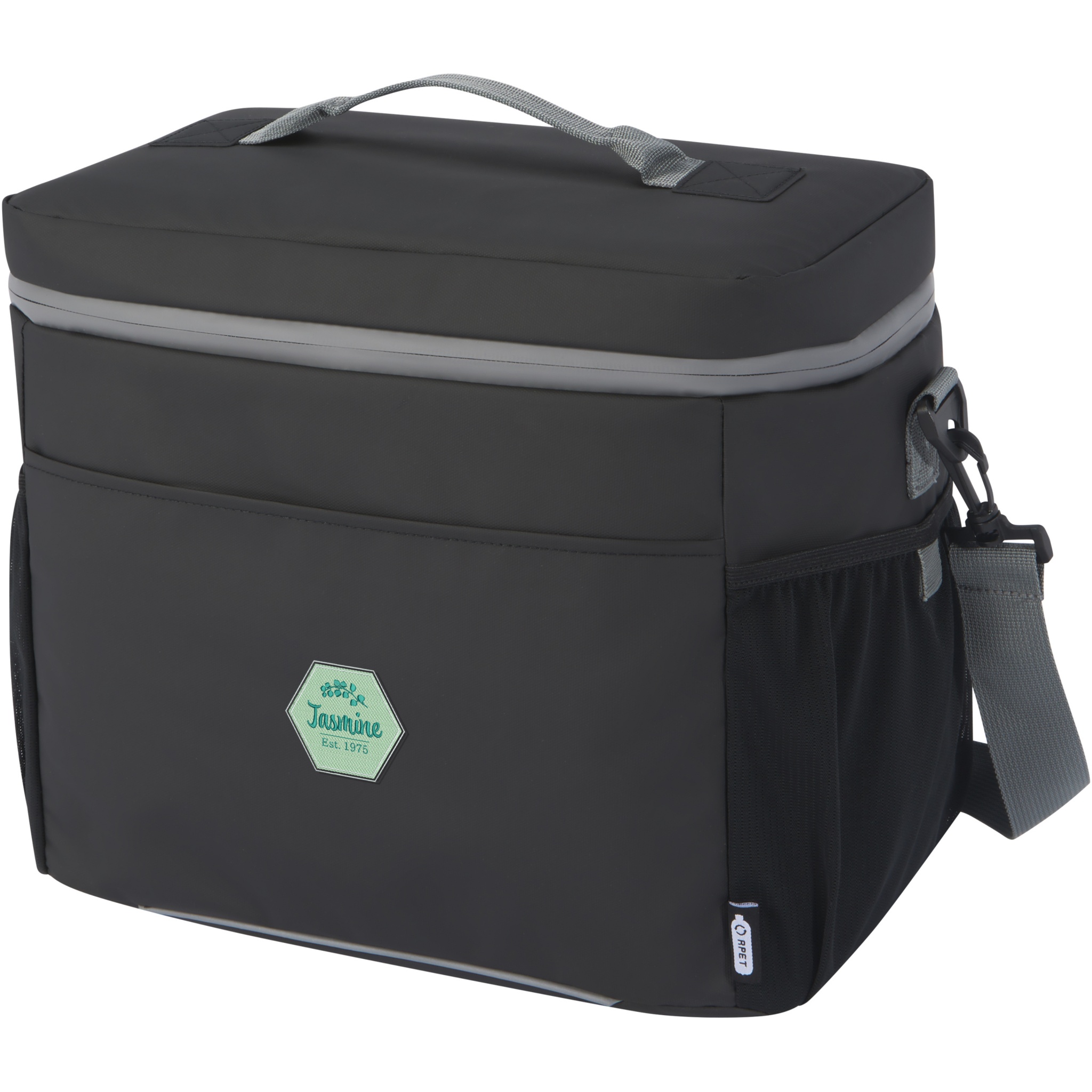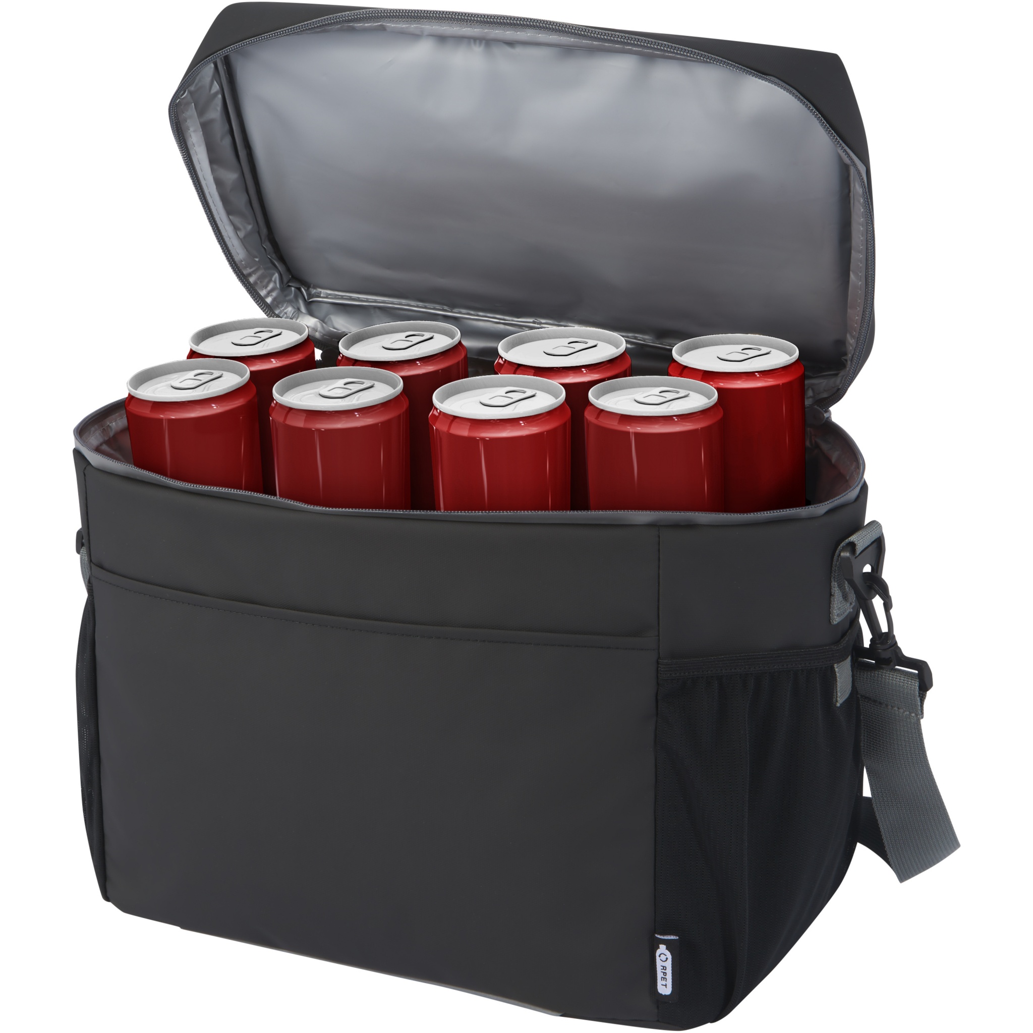 Vattentålig kylväska med plats för 20 burkar tillverkad av GRS-certifierade återvunna material, inklusive dragkedjorna. Den har ett rymligt dragkedjeförsett fack fodrat med livsmedelssäker och extra tjock högdensitets termisk PEVA och skumisolering, som håller drycker och förfriskningar kalla i timmar. Den har också två nätfickor och en öppen framficka för extra förvaring. Bärhandtaget i väv och den justerbara och vadderade axelremmen gör den bekväm att bära. De återvunna GRS-materialen inkluderar huvudtyget, fodret, väven och dragkedjorna. Kapacitet: 22 liter. PVC-fri.