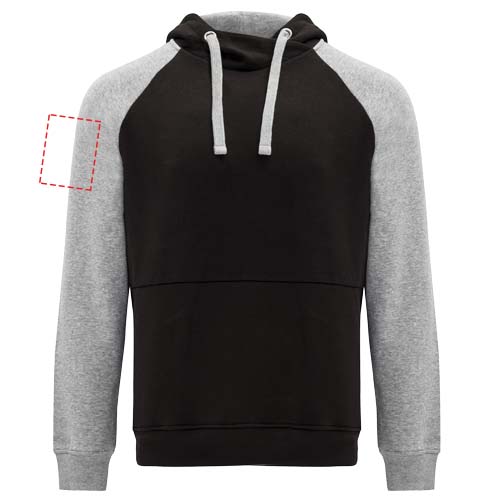 Tvåfärgad unisexhuvtröja. Huva med korsad hals och metallöglor. Kontrasterande innerhuva, dragsko och raglanärmar. Känguruficka. Muddar och fåll i ribbstickad 1 x 1 elastan. Avtagbar etikett.