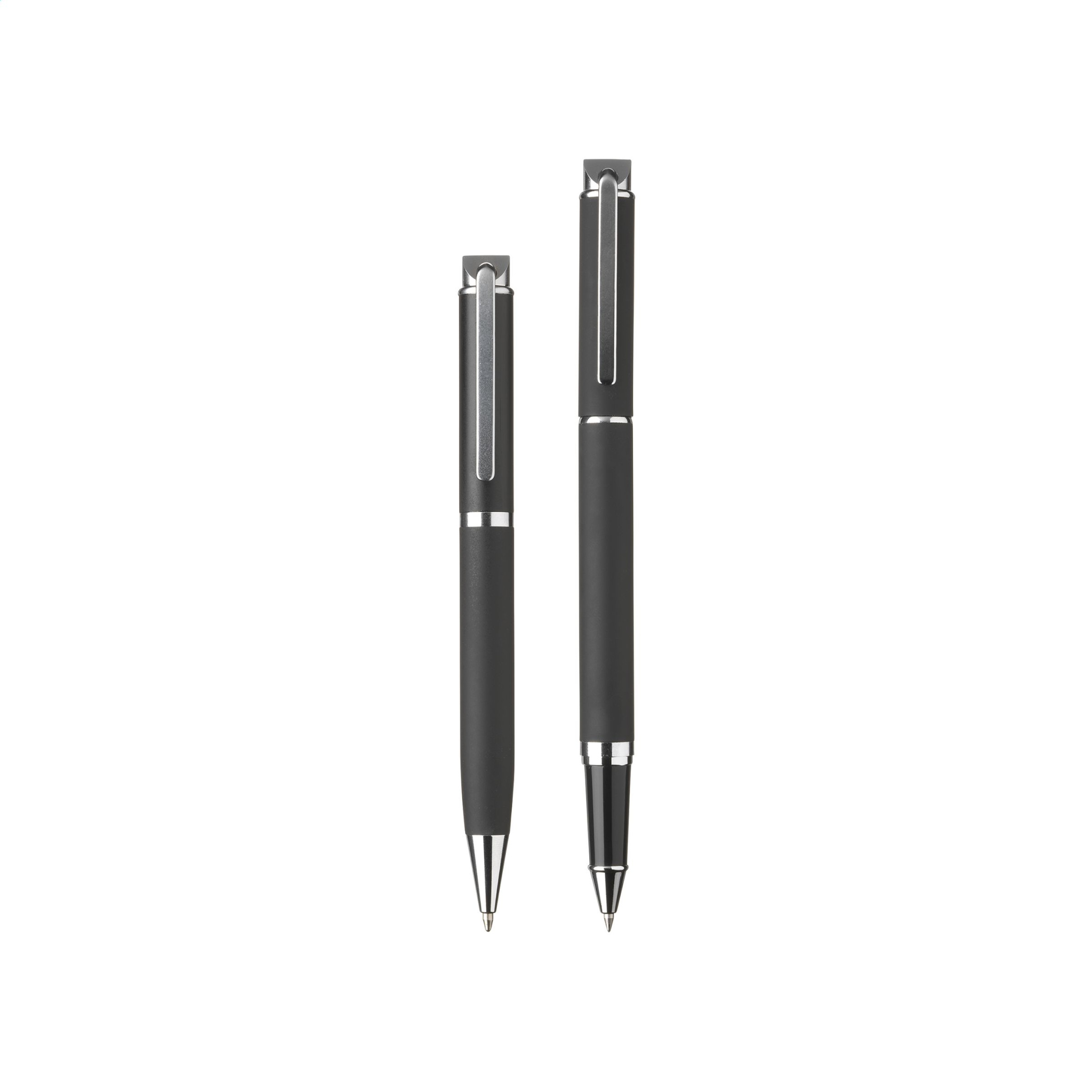 Skrivset i metall: penna med blått bläck och rullpenna. Båda med snygg gummerad finish, vackert designad topp med klämma och glansiga accenter. Artiklar levereras som ett set med, varje set individuellt förpackad.