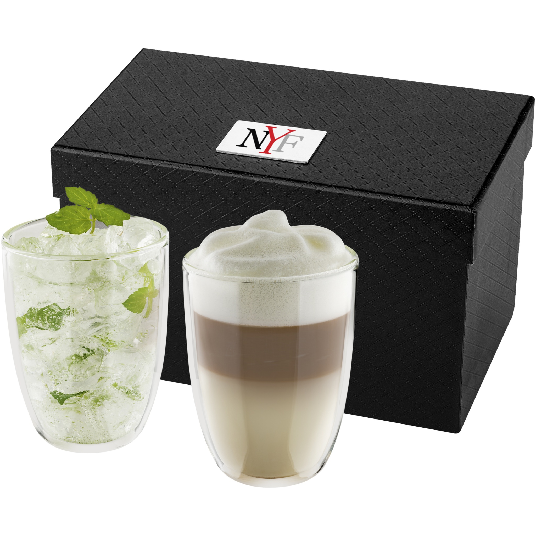 Set med isolerande glas med dubbla väggar. Volym 290 ml. Perfekta att servera din latte macchiato, iste eller valfri typ av varm och kall dryck i. Lyxig presentförpackning inlusive logoplatta.