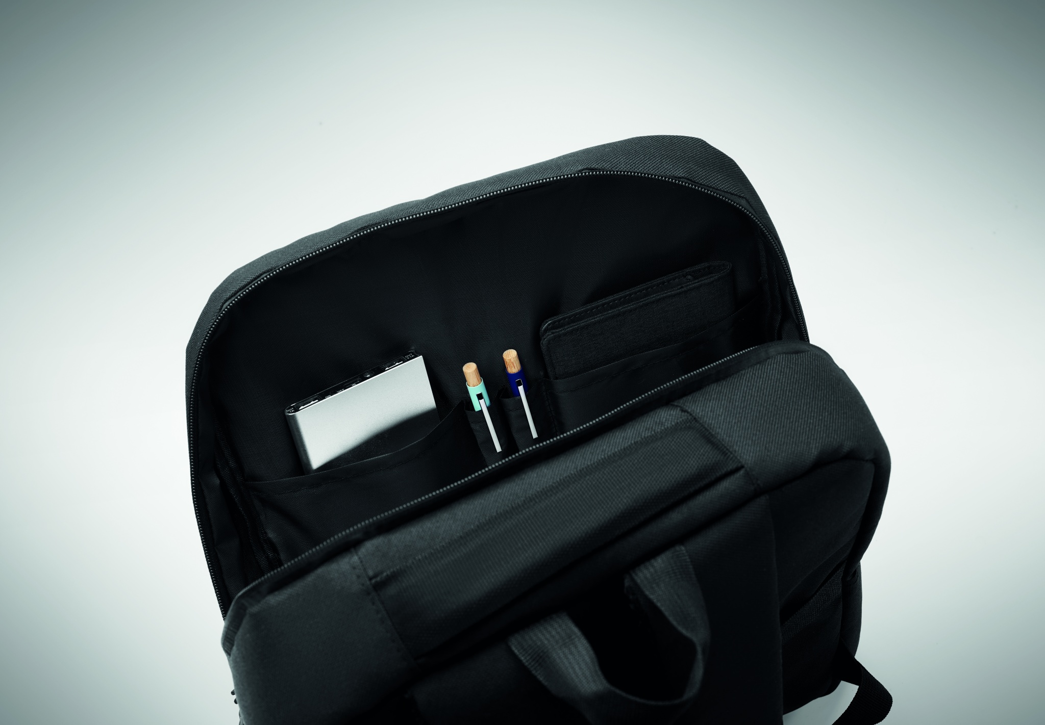 15'' dataryggsäck i 600D RPET-polyester och 210D-foder. Utvändig blixtlåsförsedd ficka för 10''-platta, 2 invändiga fickor. Ficka med dragkedja på framsidan. 2 sidofickor med dragkedja. Mjukt vadderade rygg- och axelremmar. Hållför resväska.