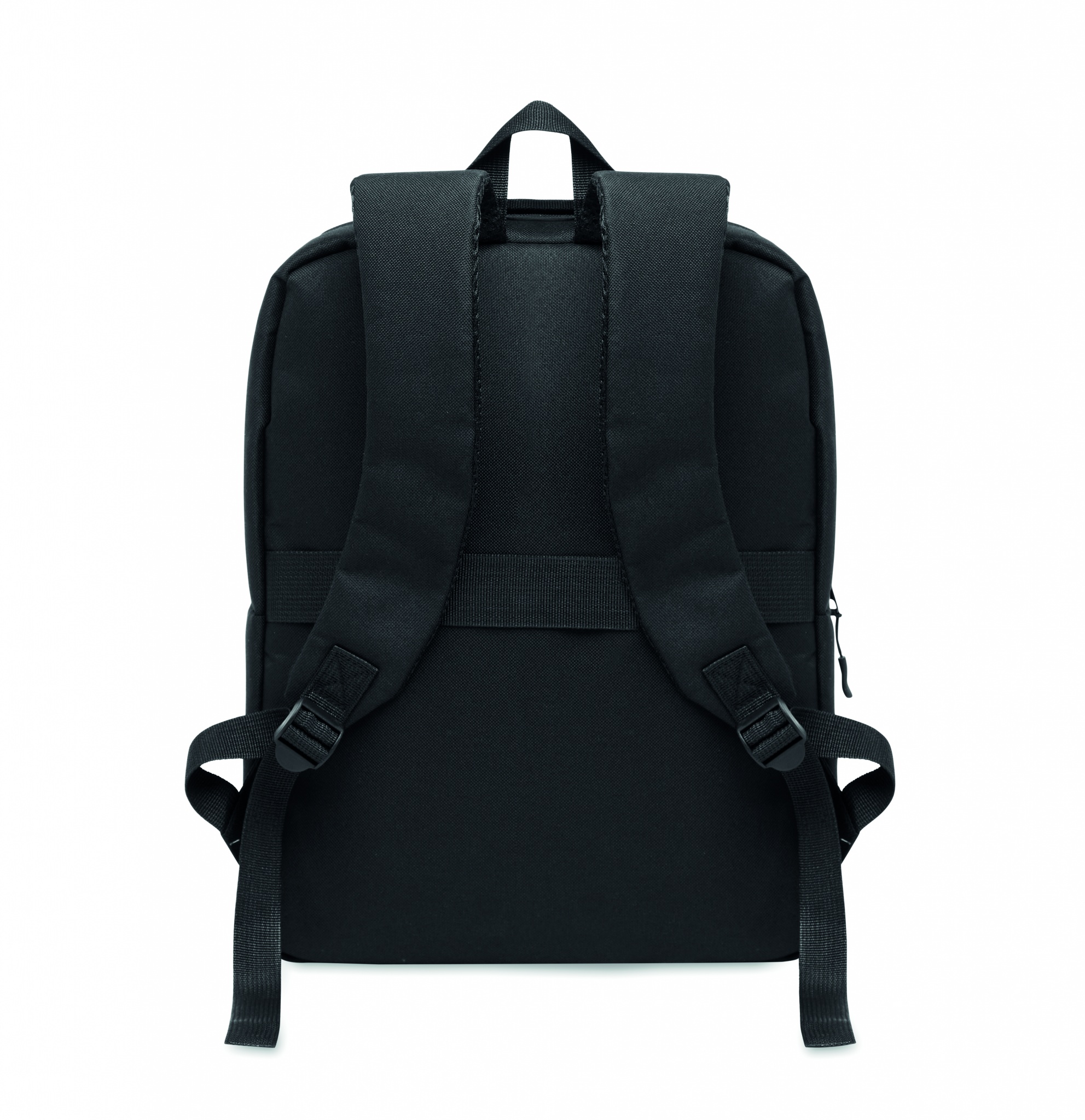 En 15''  ryggsäck tillverkad av 600D RPET-polyester med 210D-foder och anpassningsbar tryckning, Svart