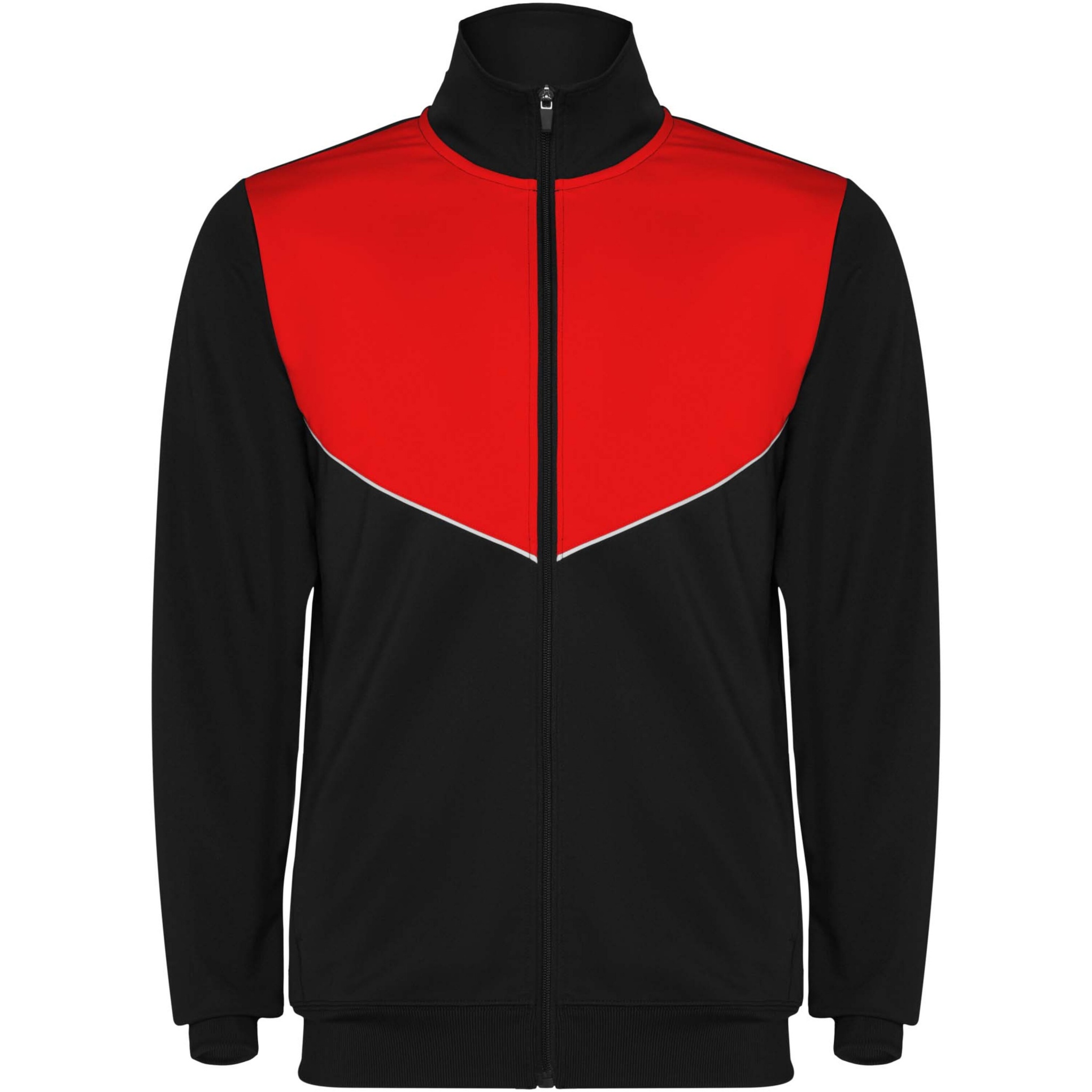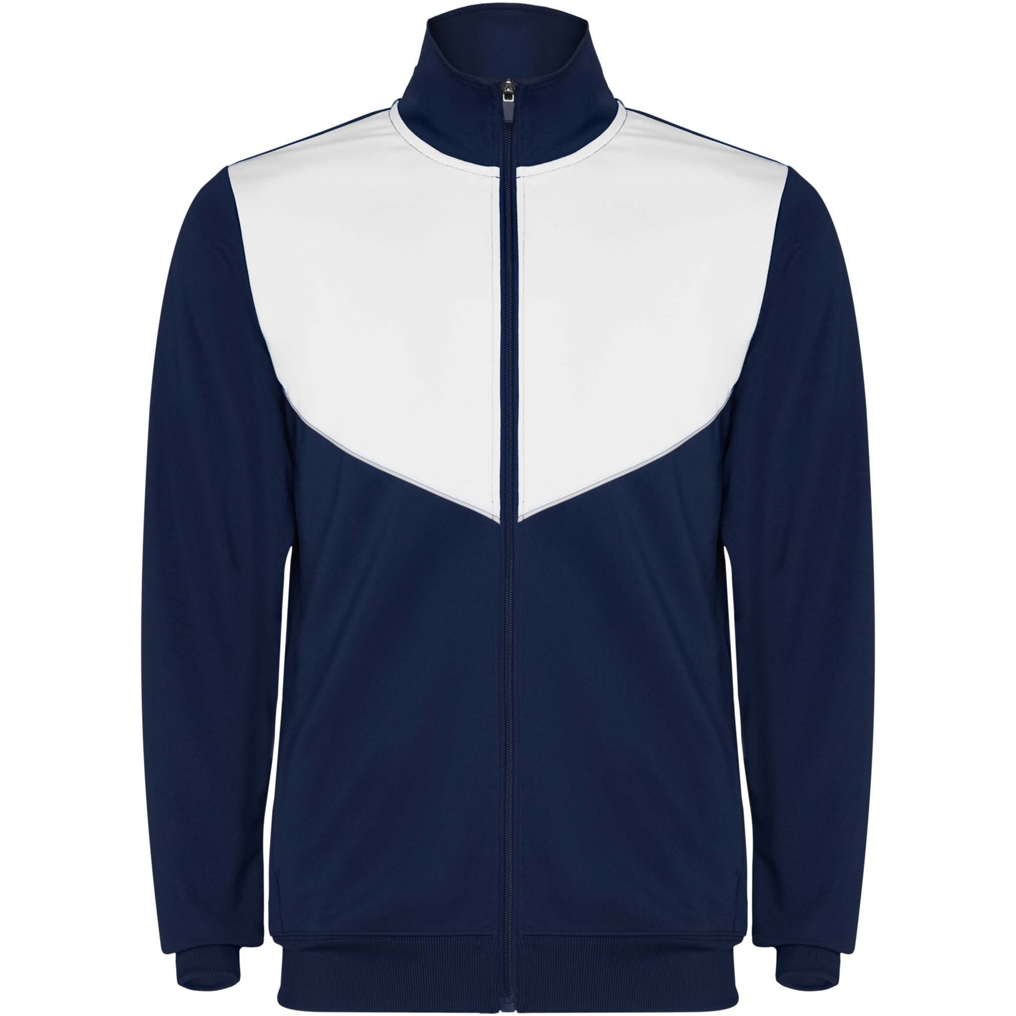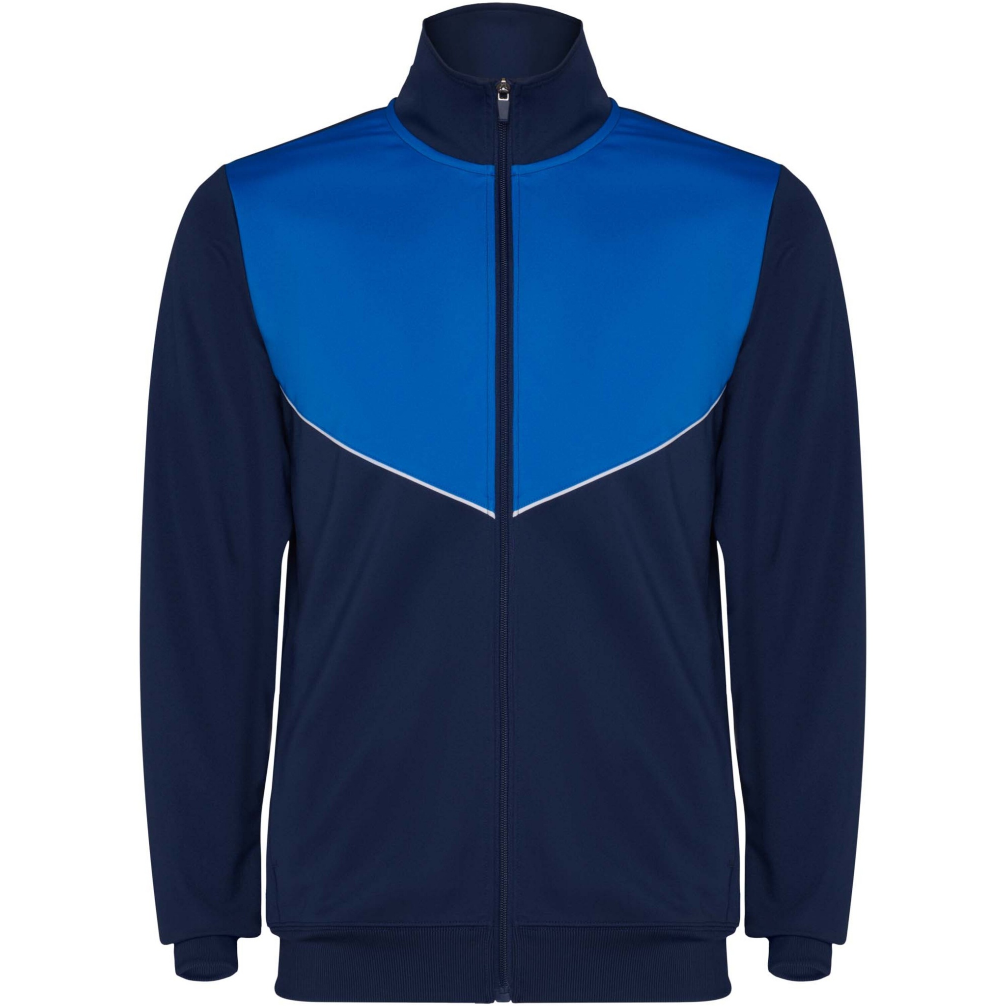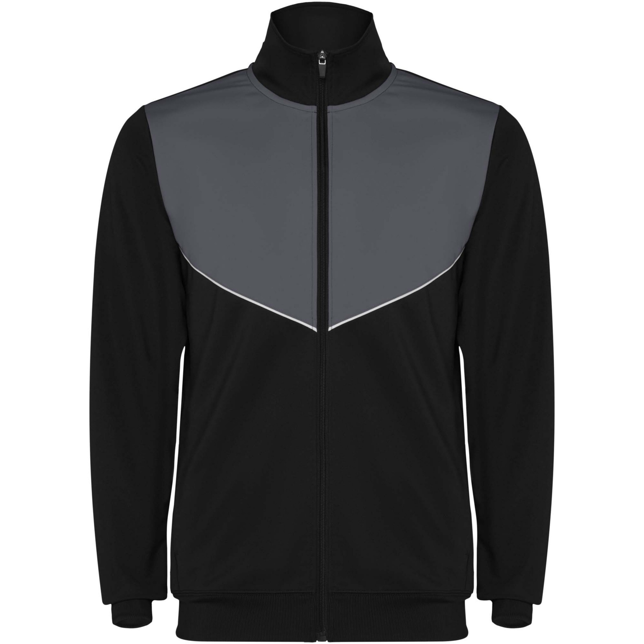 Träningsoverall i lätt och elastiskt tyg. Jacka med kontrasterande färg och sömnadskant på bröstet. Hög krage med kontrasterande sömmar. Centralt blixtlås fram. Sidofickor. 2 x 2 ribbade muddar och midja. Byxor med elastisk linning och dragsko. Kontrasterande sidostycke med sömnadskant. Dragkedja i fåll.