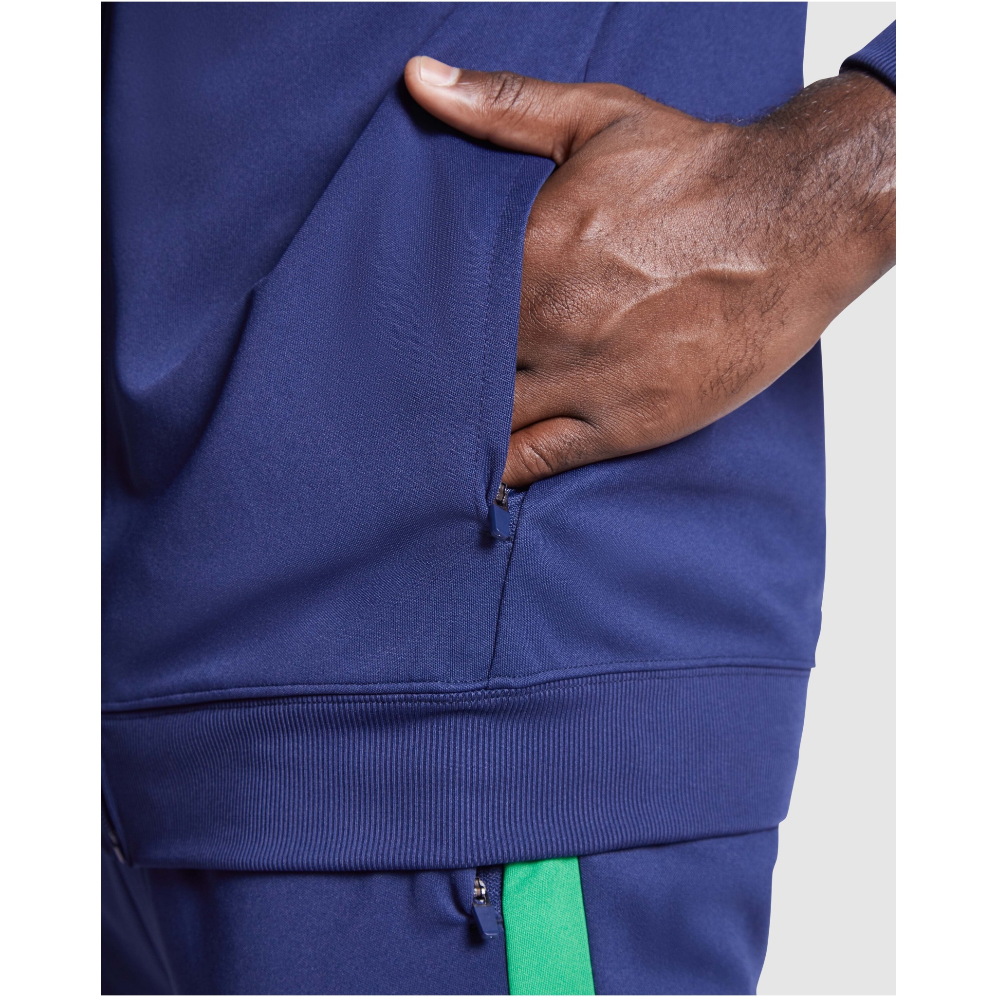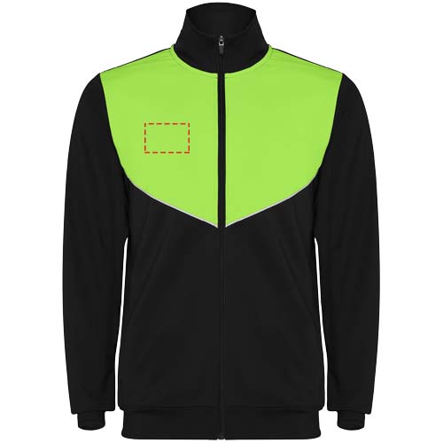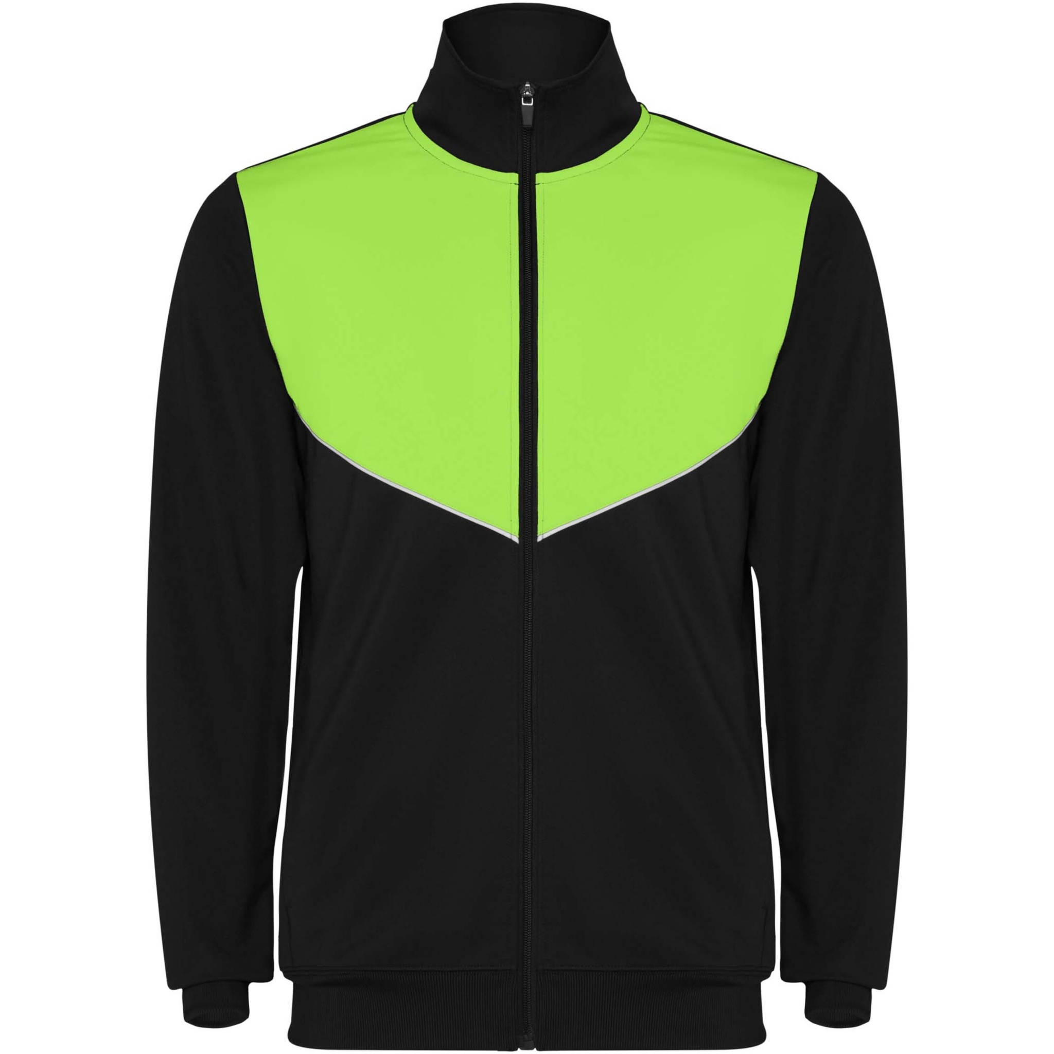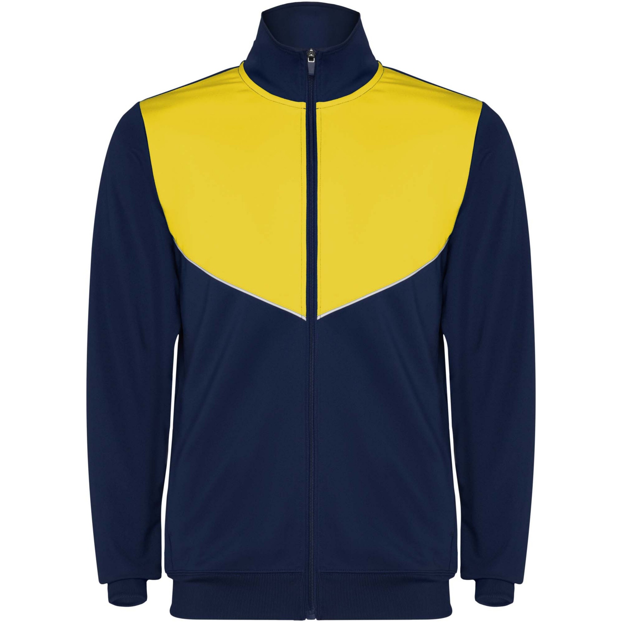 Träningsoverall i lätt och elastiskt tyg. Jacka med kontrasterande färg och sömnadskant på bröstet. Hög krage med kontrasterande sömmar. Centralt blixtlås fram. Sidofickor. 2 x 2 ribbade muddar och midja. Byxor med elastisk linning och dragsko. Kontrasterande sidostycke med sömnadskant. Dragkedja i fåll.