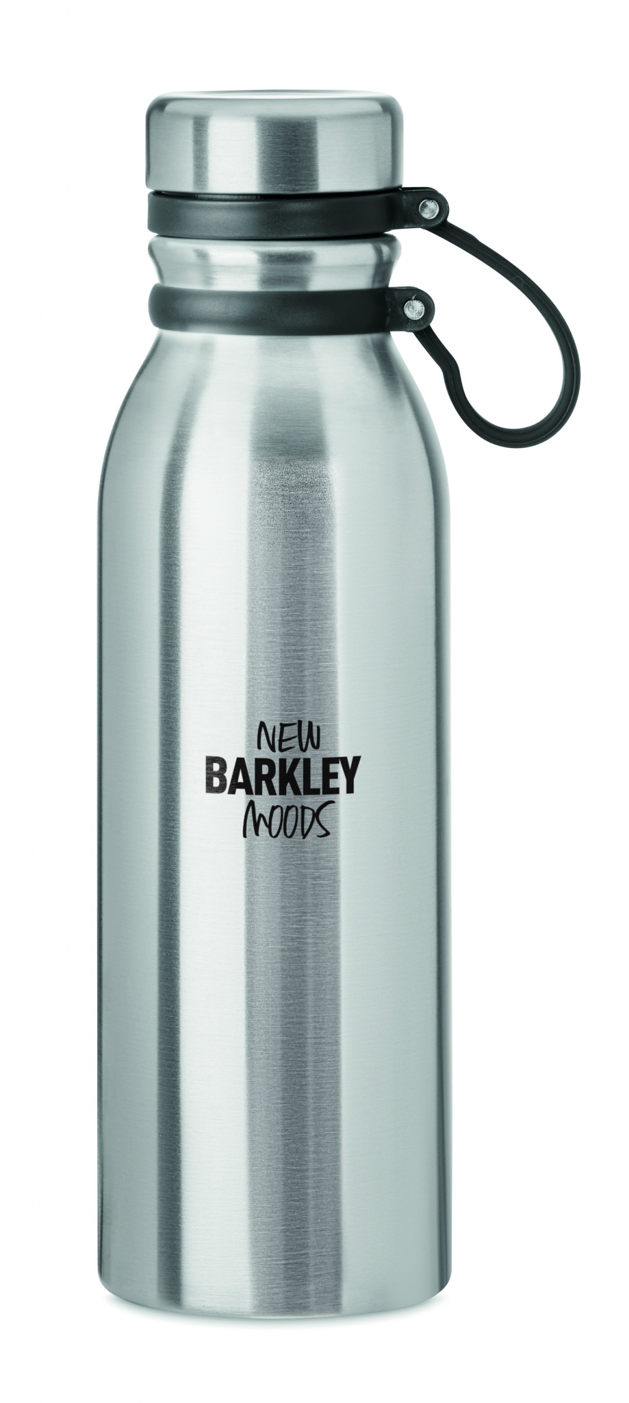 Flaska med dubbelvägg i rostfritt stål och silikongrepp som gör den lätt att bära. Fri från BPA. Läckagefri. Kapacitet: 600 ml. Läckagefritt.