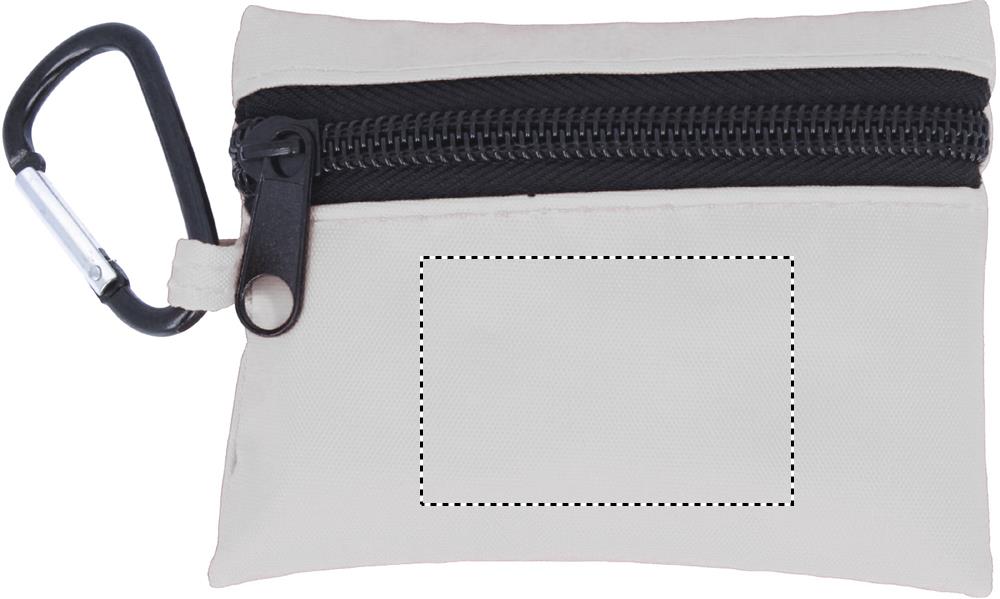 Förstaförband kit innehållande sax, en våtservett, en gasbinda, 3 bomullpads och 5 plåster. Packat i polyester påse med karbinhake.
