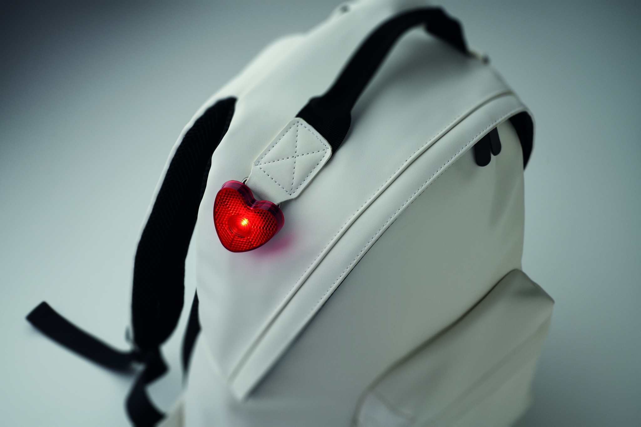 Hjärtformad röd reflexlampa i ABS med klämma på baksidan. Olika ljusfunktioner. Inklusive 2 utbytbara LR44-batterier.